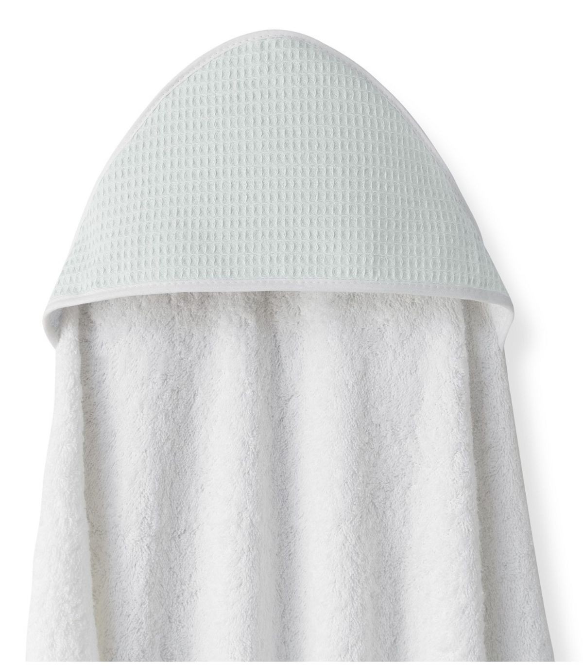 Capa de baño para bebé, modelo delantal. Capa confeccionada en rizo extra suave en tono blanco y la capucha en tejido wafle tono verde suave. La capa modelo delantal facilita la tarea a la hora de sacar al bebé de la bañera al llevarla tu colgando del cuello. Tamaño de la capa 1X1 metro