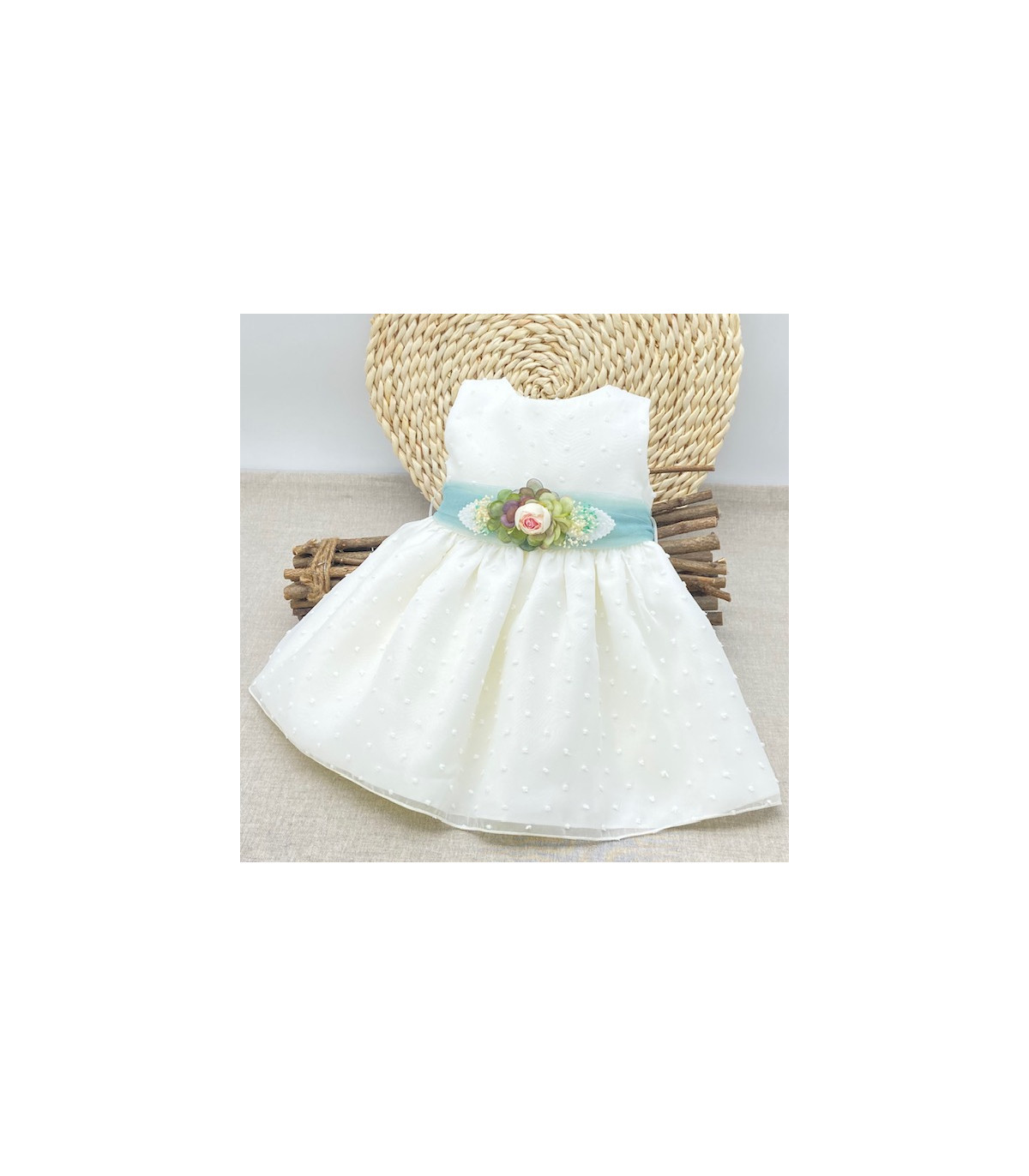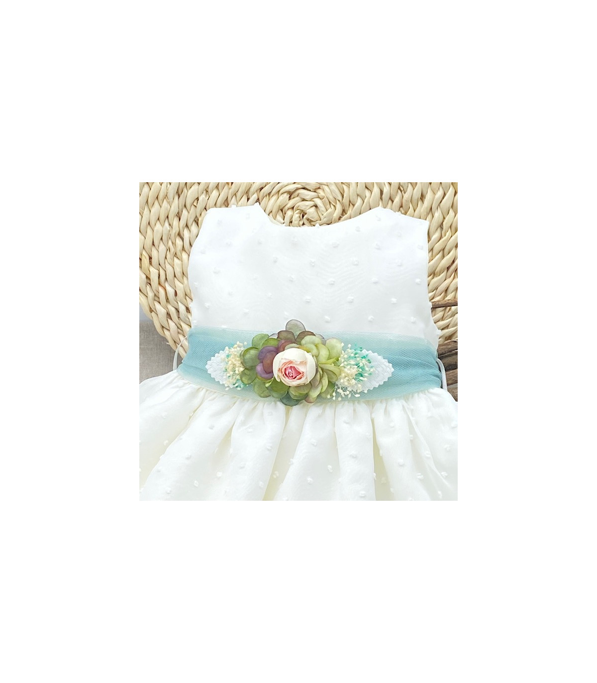 Vestido en gasa plumeti sin mangas y en tono blanco roto. Abrochado en la espalda, con lazada en tul verde agua. En la lazada lleva un aplique en flores