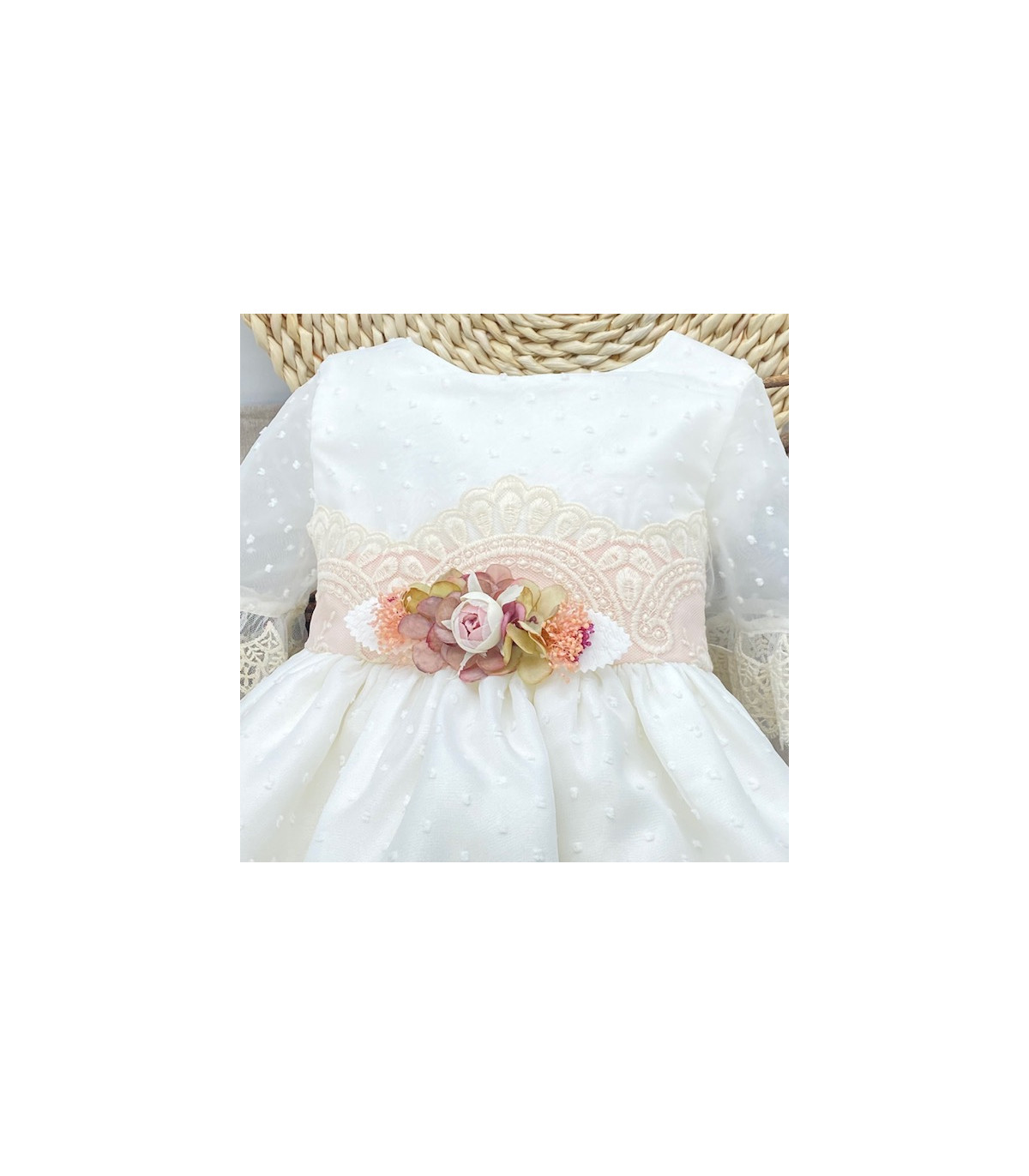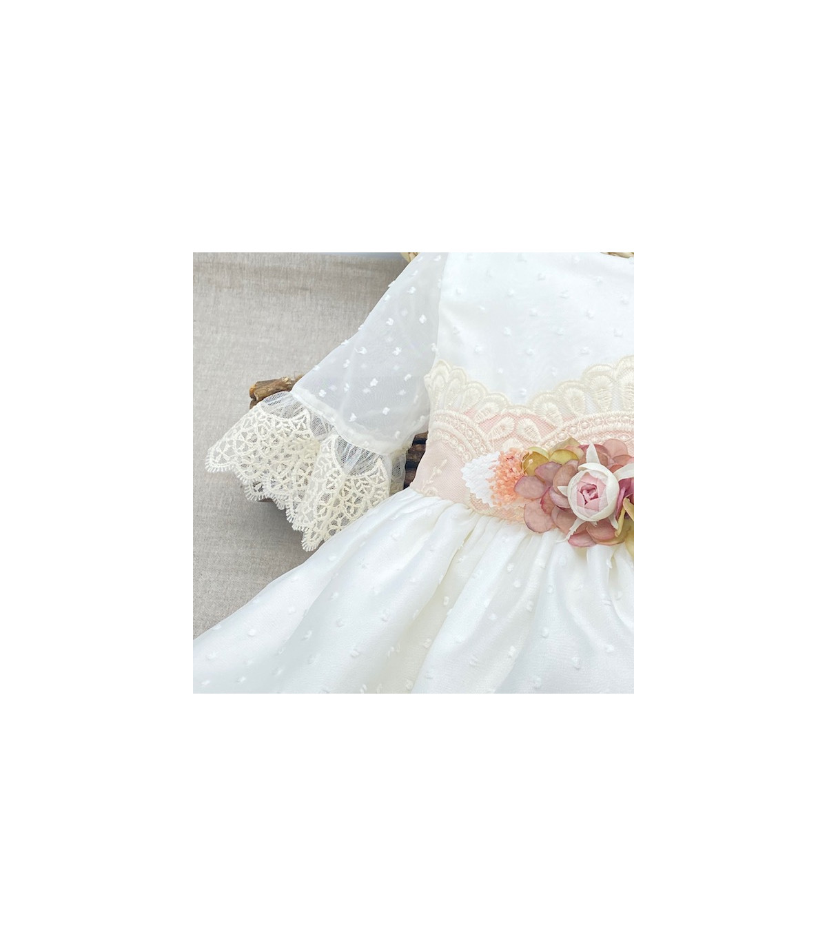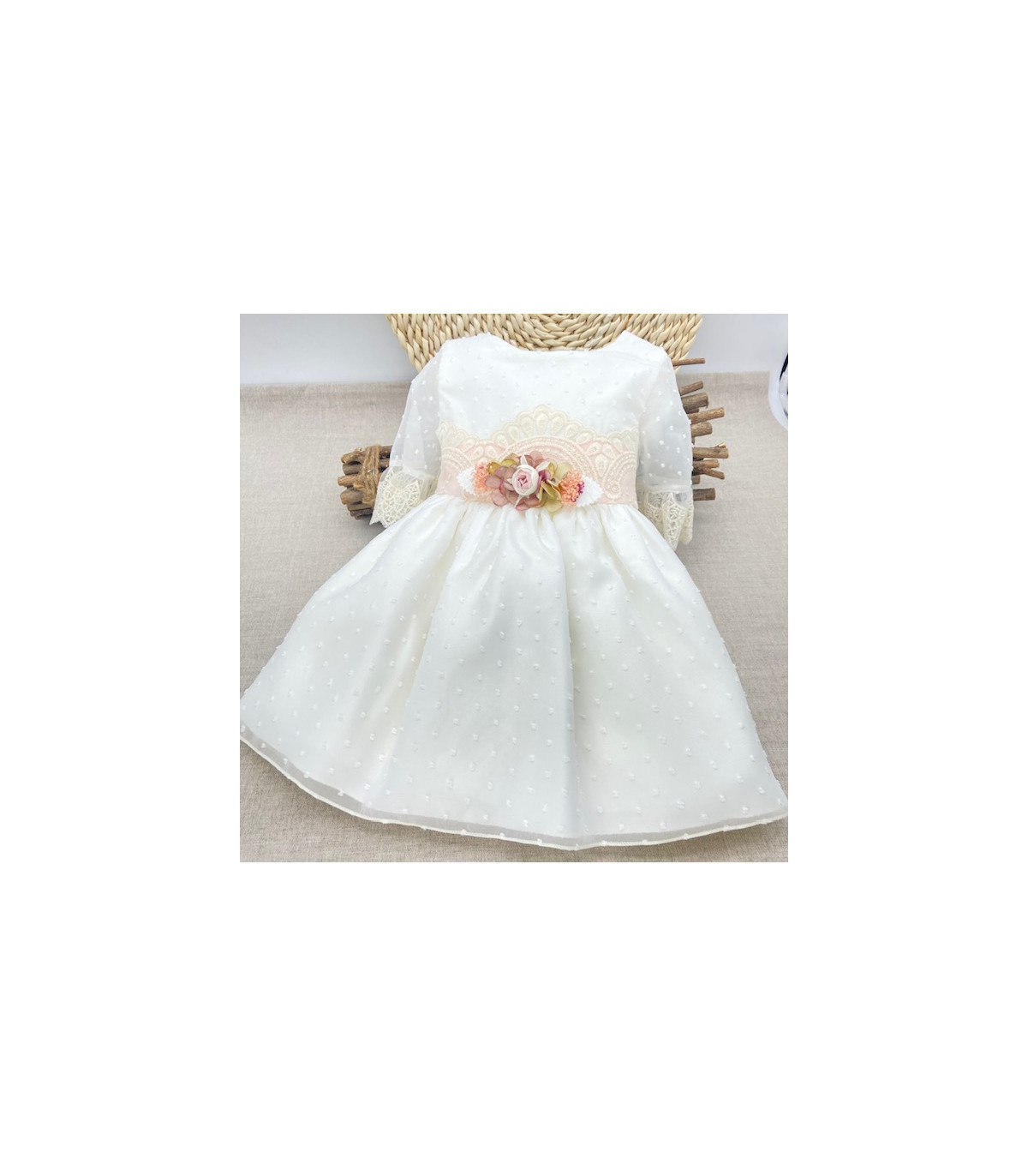 Vestido de gasa en plumeti en tono blanco roto, con manga tres cuartos con volante de encaje. A la altura de la cintura lleva aplique de encaje en tono rosa salmón muy clarito con aplique de flores en el centro.