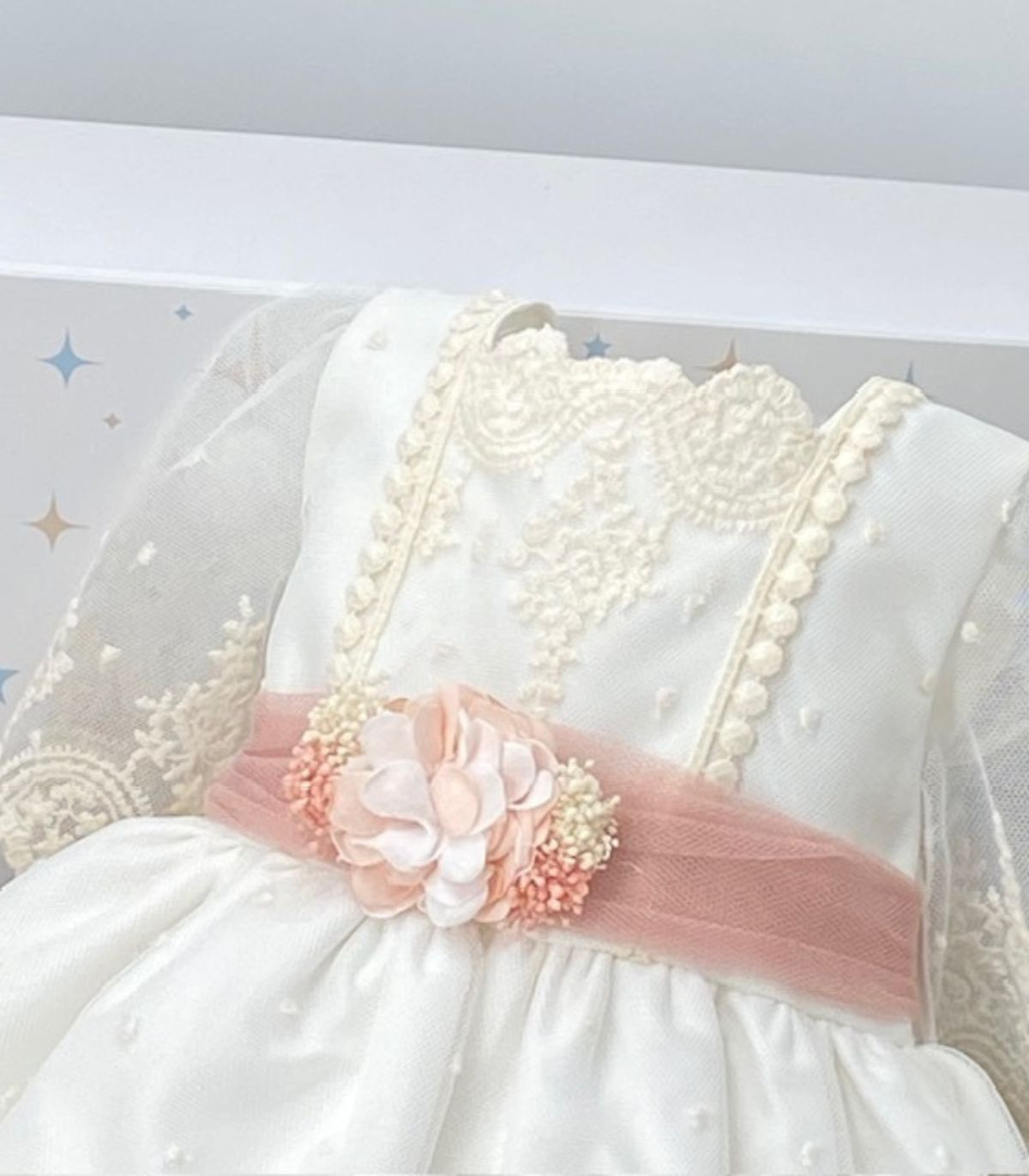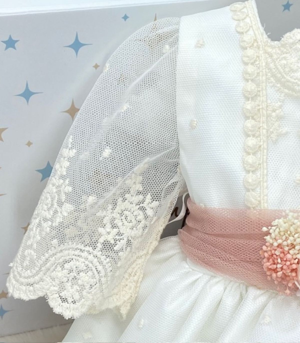 Elegante vestido de ceremonia confeccionado en un delicado tul bordado en tono natural. Su diseño de manga francesa aporta un toque clásico y sofisticado, mientras que la cintura se realza con una hermosa lazada de tul en tono rosa empolvado, adornada con un fino aplique de flores en la parte delantera. Un vestido ideal para ocasiones especiales, combinando dulzura y elegancia en cada detalle.