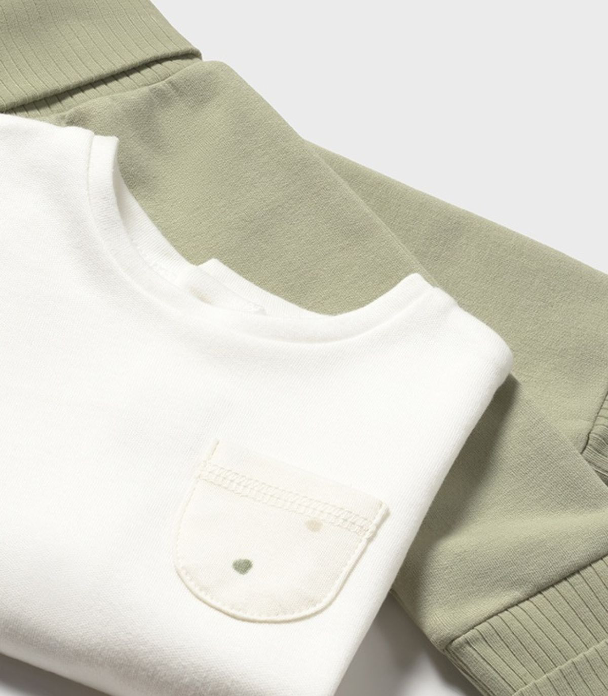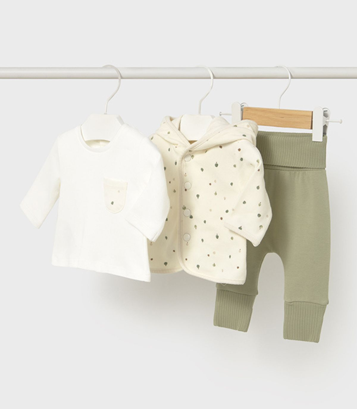 Conjunto de la nueva colección otoño-invierno de Mayoral, compuesto por una chaqueta de manga larga con capucha y cierres a presión en la parte delantera, ideal para los días más frescos. El pantalón, con cintura elástica, garantiza comodidad y libertad de movimiento. Completa el conjunto una camiseta de manga larga, perfecta para combinar también con otras prendas. Un look versátil y práctico para el día a día del bebé.
