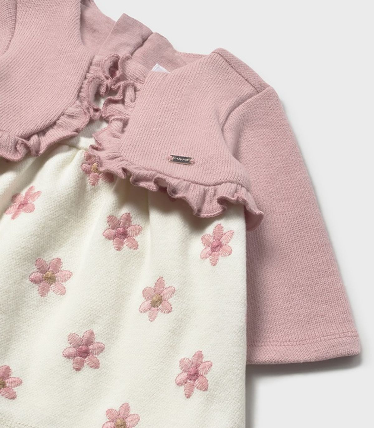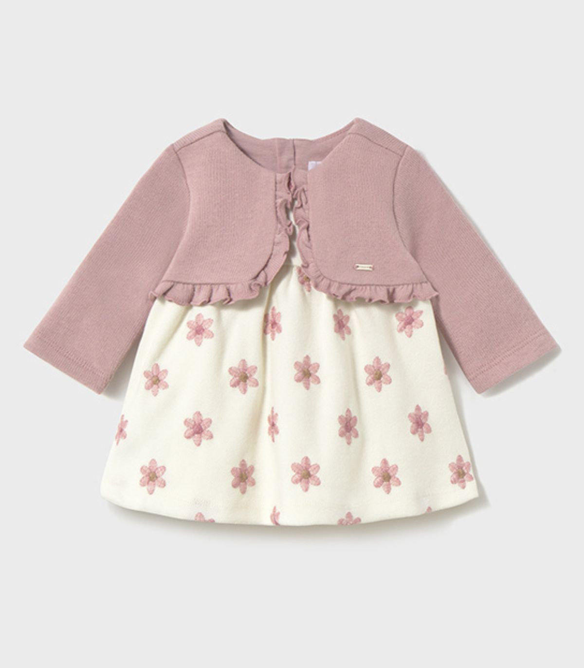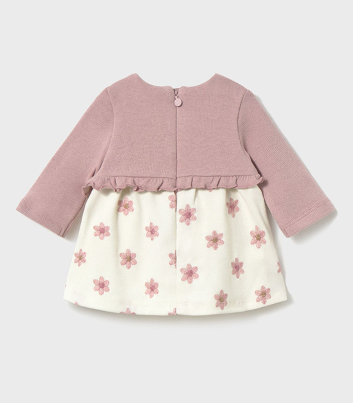 Vestido para bebé niña de la marca Mayoral, colección otoño-invierno. Un diseño de manga larga que simula un conjunto de dos piezas, pero siendo una sola prenda para mayor comodidad. Con cuello redondo y cierre de cremallera en la espalda, facilita la puesta de la prenda sin perder estilo. Un vestido práctico y encantador, ideal para los días más frescos de la temporada.