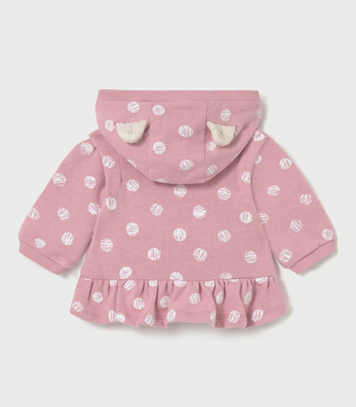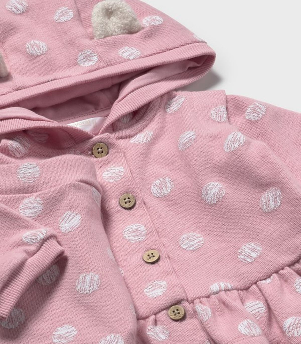 Conjunto de la nueva colección otoño-invierno de Mayoral, compuesto por una chaqueta de manga larga con capucha y cierre con botones en la parte delantera, ideal para los días más frescos. El pantalón, con cintura elástica, garantiza comodidad y libertad de movimiento. Completa el conjunto una camiseta de manga larga con motivos infantiles, perfecta para combinar también con otras prendas. Un look versátil y práctico para el día a día del bebé.