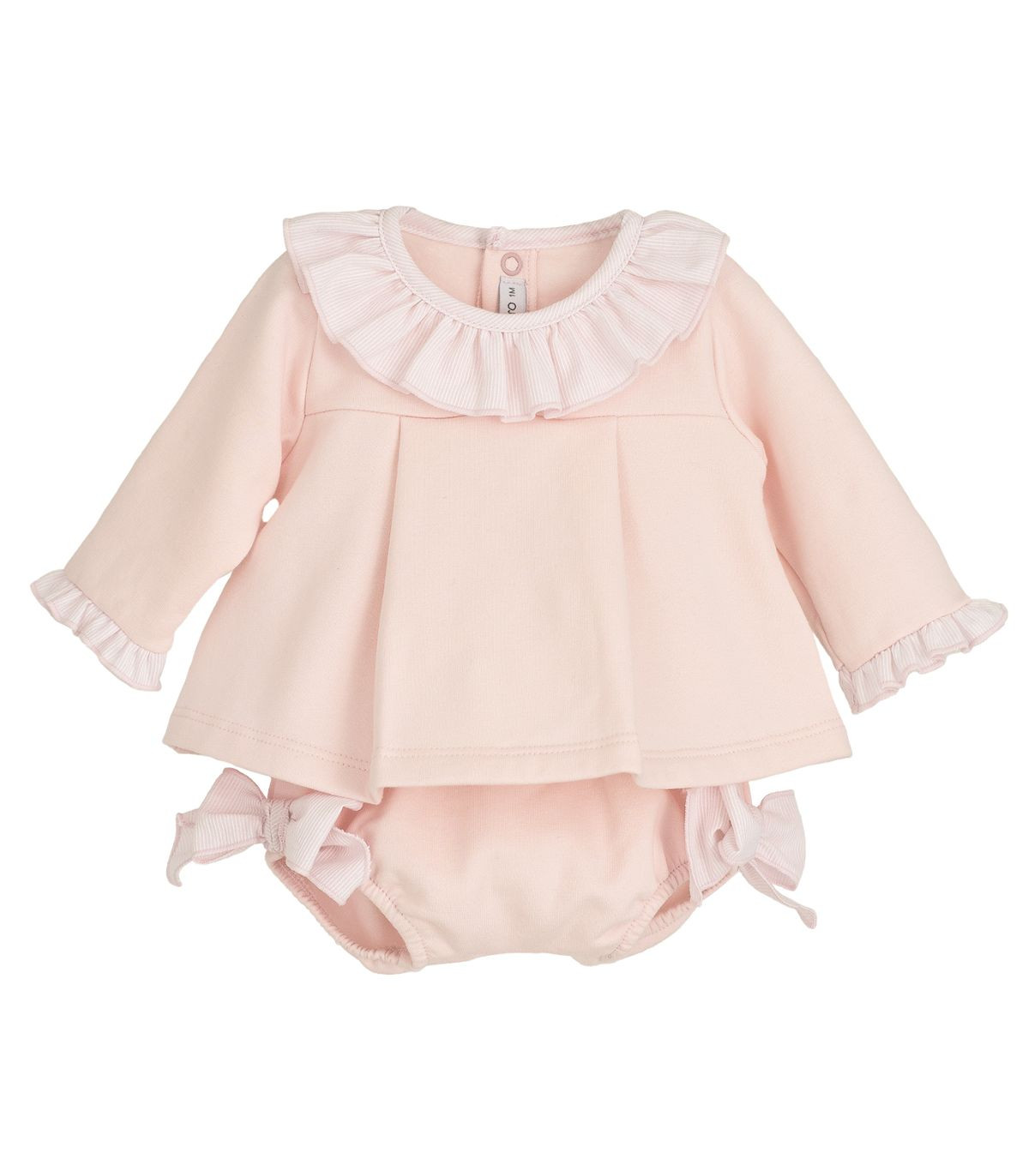 Conjunto para niña de la temporada otoño-invierno, compuesto por sudadera y pololo tipo ranita en tono rosa. La sudadera de manga larga con volante en el cuello se abrocha en la espalda con prácticos cierres a presión para facilitar la puesta. El pololo a juego, con elásticos en la cintura y las piernas para mayor comodidad, lleva como detalle dos lacitos a los lados que aportan un toque encantador. Confeccionado en un tejido suave y calentito, ideal para los días más fríos de la temporada.