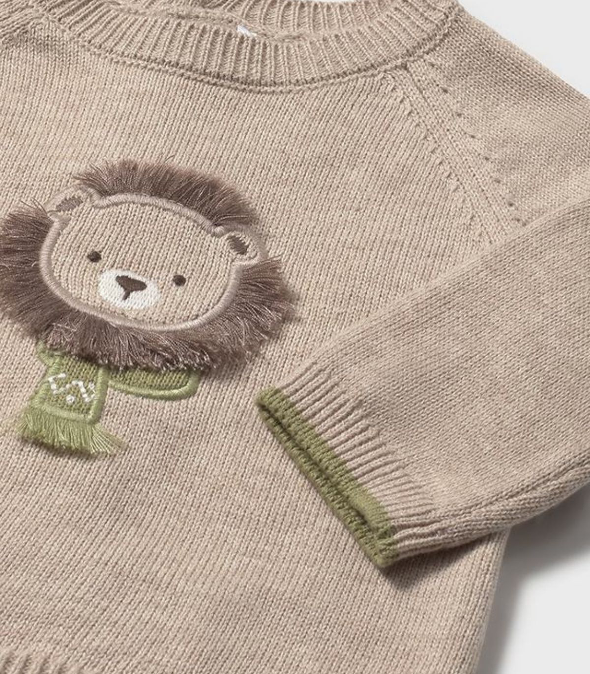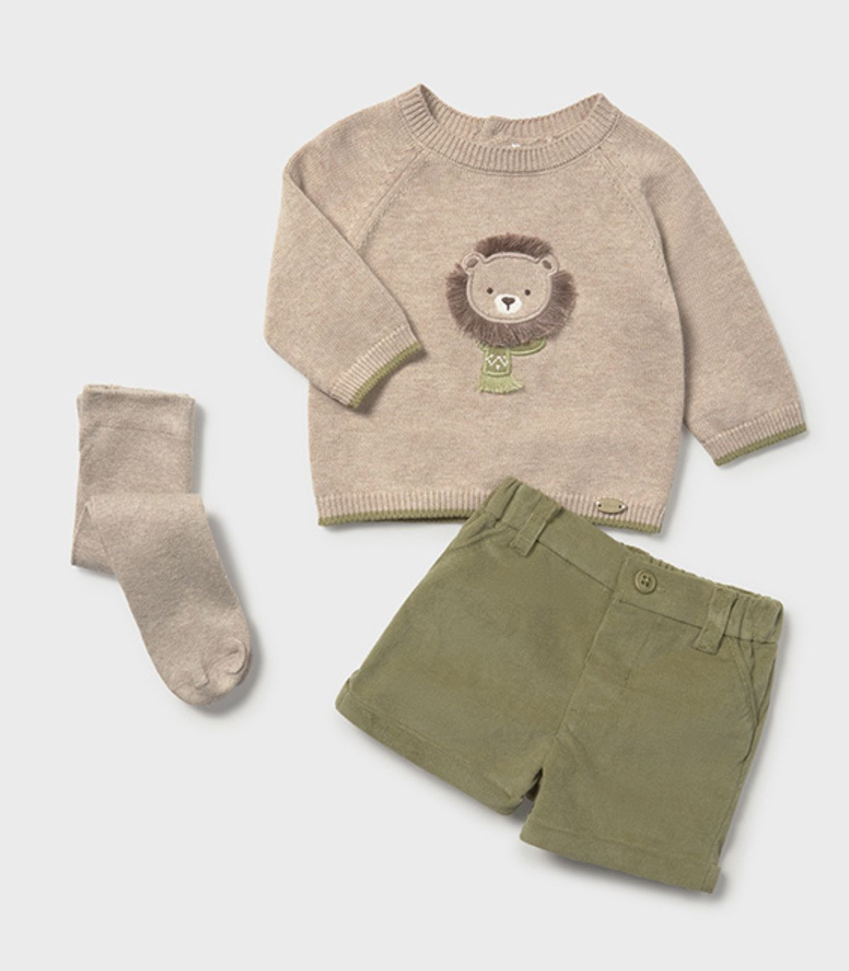 Conjunto para bebé niño de Mayoral, perfecto para la temporada otoño-invierno. Incluye un jersey de tricot de manga larga con cuello redondo, que destaca por un delicado aplique bordado en el centro del delantero. El pantalón corto en tono verde, con cintura elástica, asegura un ajuste cómodo y perfecto. Completa el conjunto unos leotardos a juego, aportando calidez y estilo para los días más frescos.