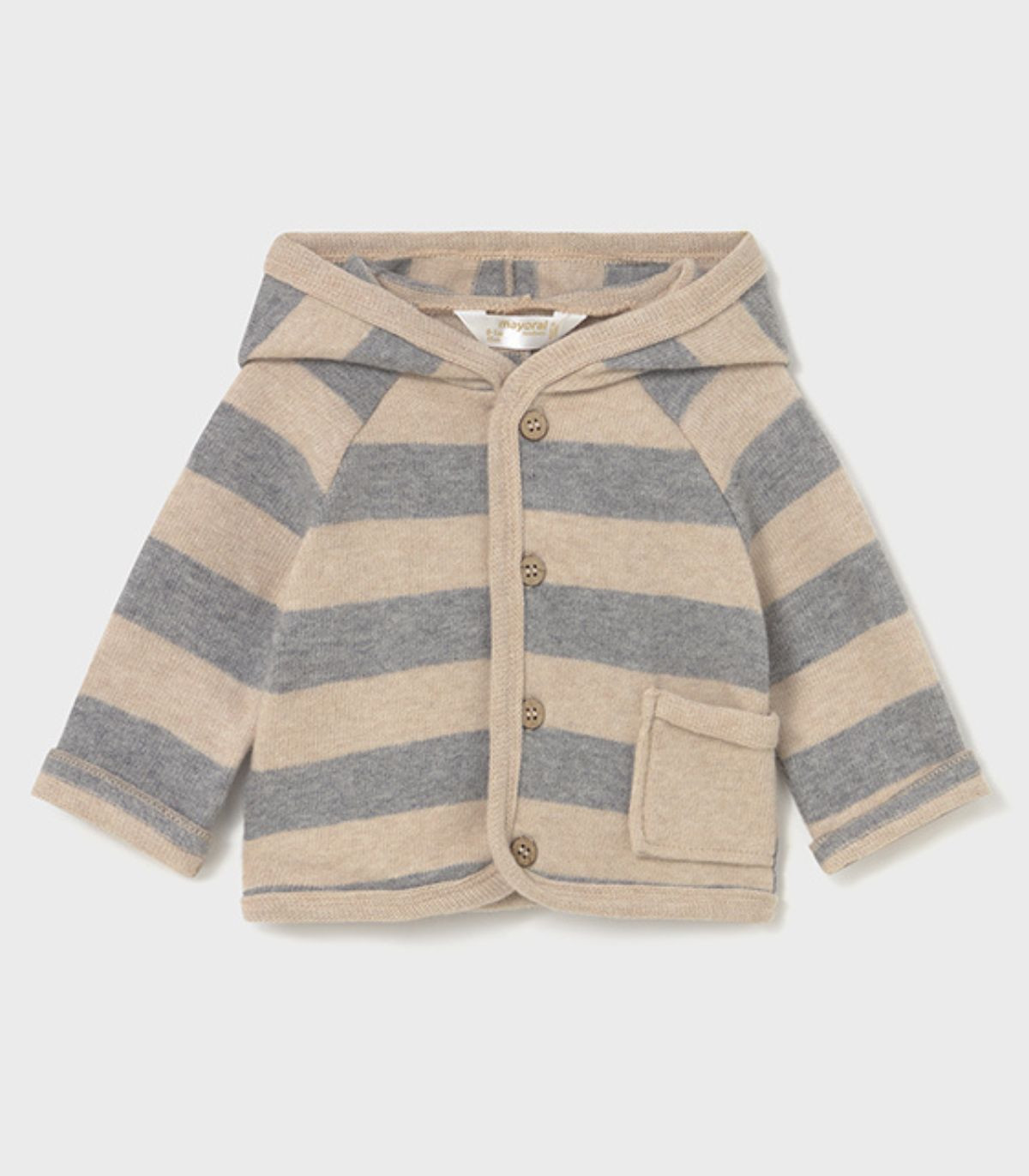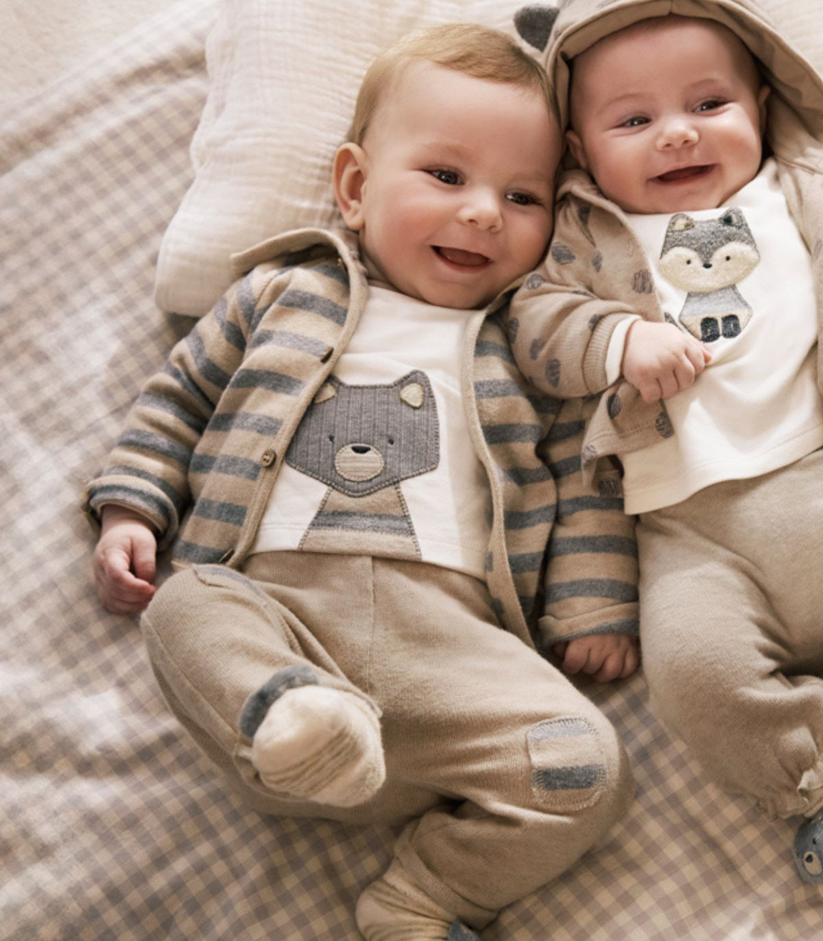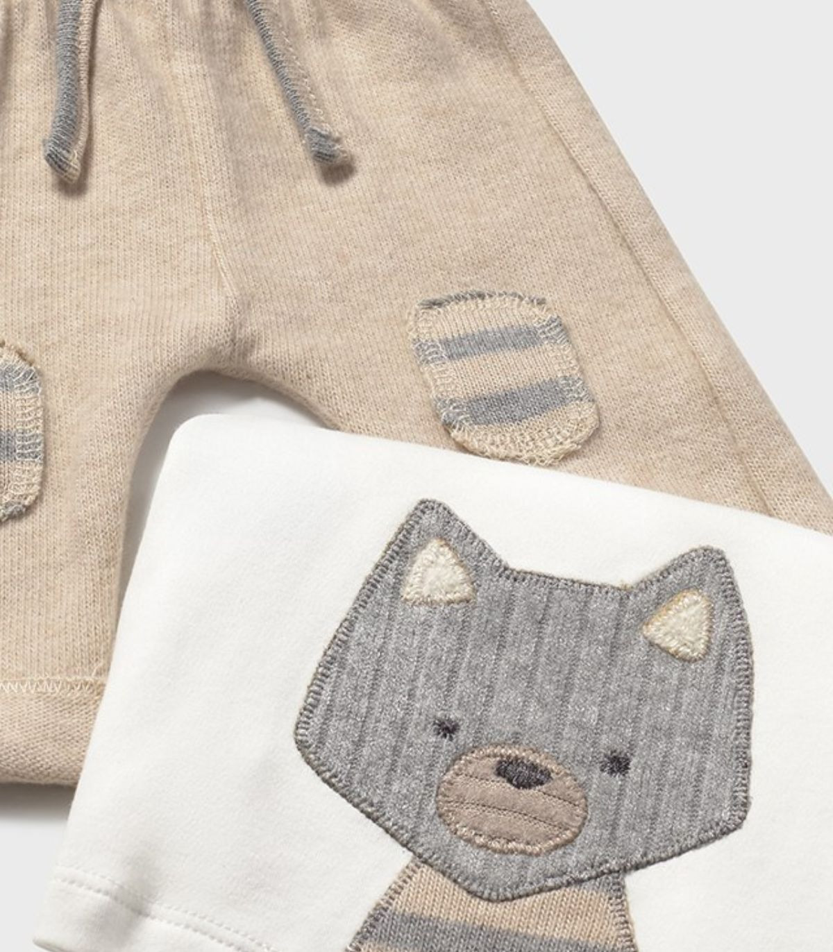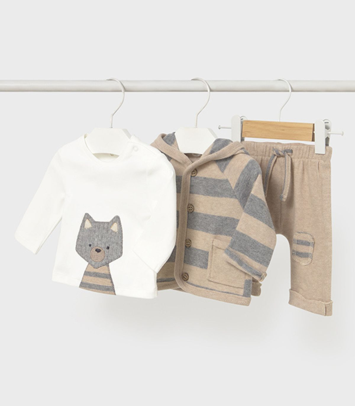 Conjunto de la nueva colección otoño-invierno de Mayoral, compuesto por una chaqueta de manga larga con capucha y se abrocha en botones en la parte delantera, ideal para los días más frescos. El pantalón, con cintura elástica, garantiza comodidad y libertad de movimiento. Completa el conjunto una camiseta de manga larga con motivos infantiles, perfecta para combinar también con otras prendas. Un look versátil y práctico para el día a día del bebé.