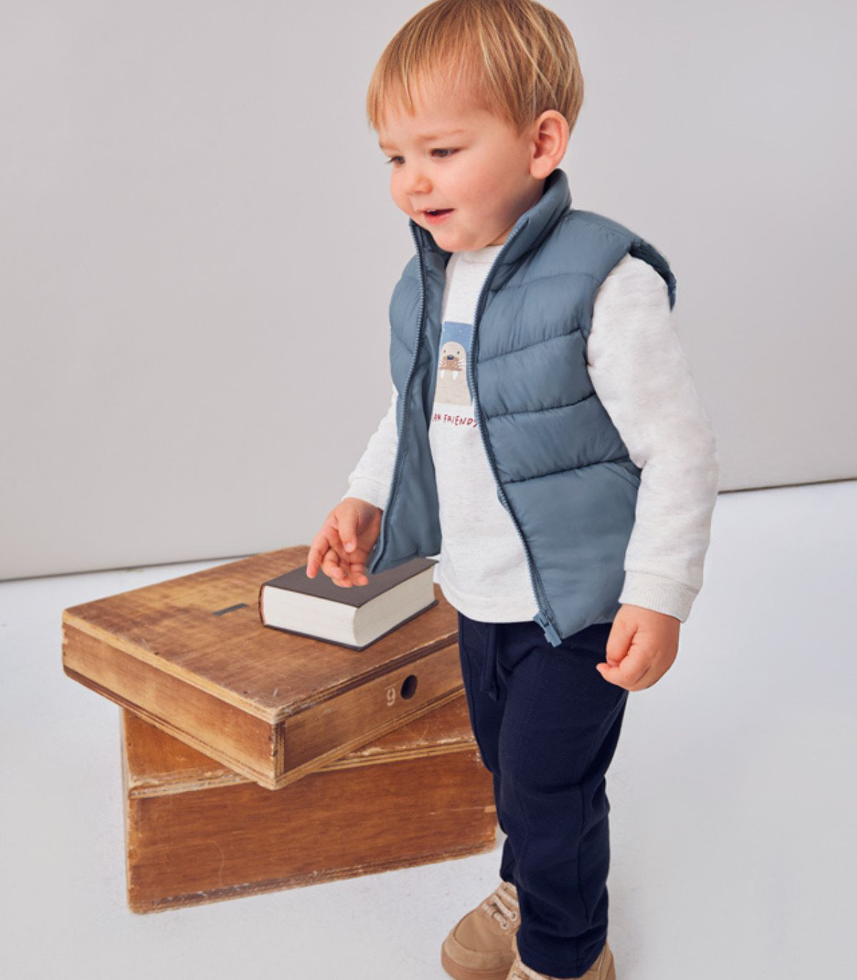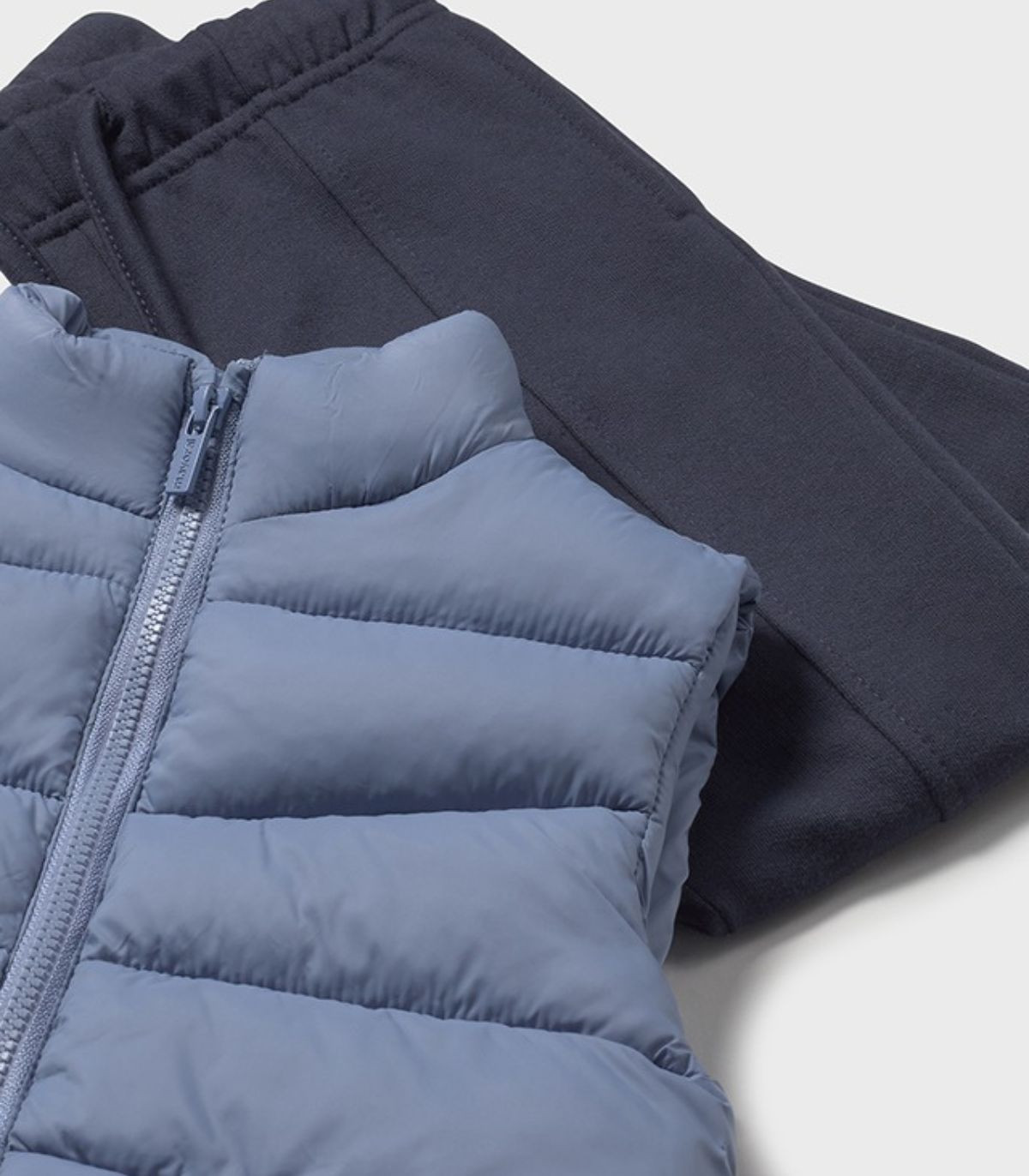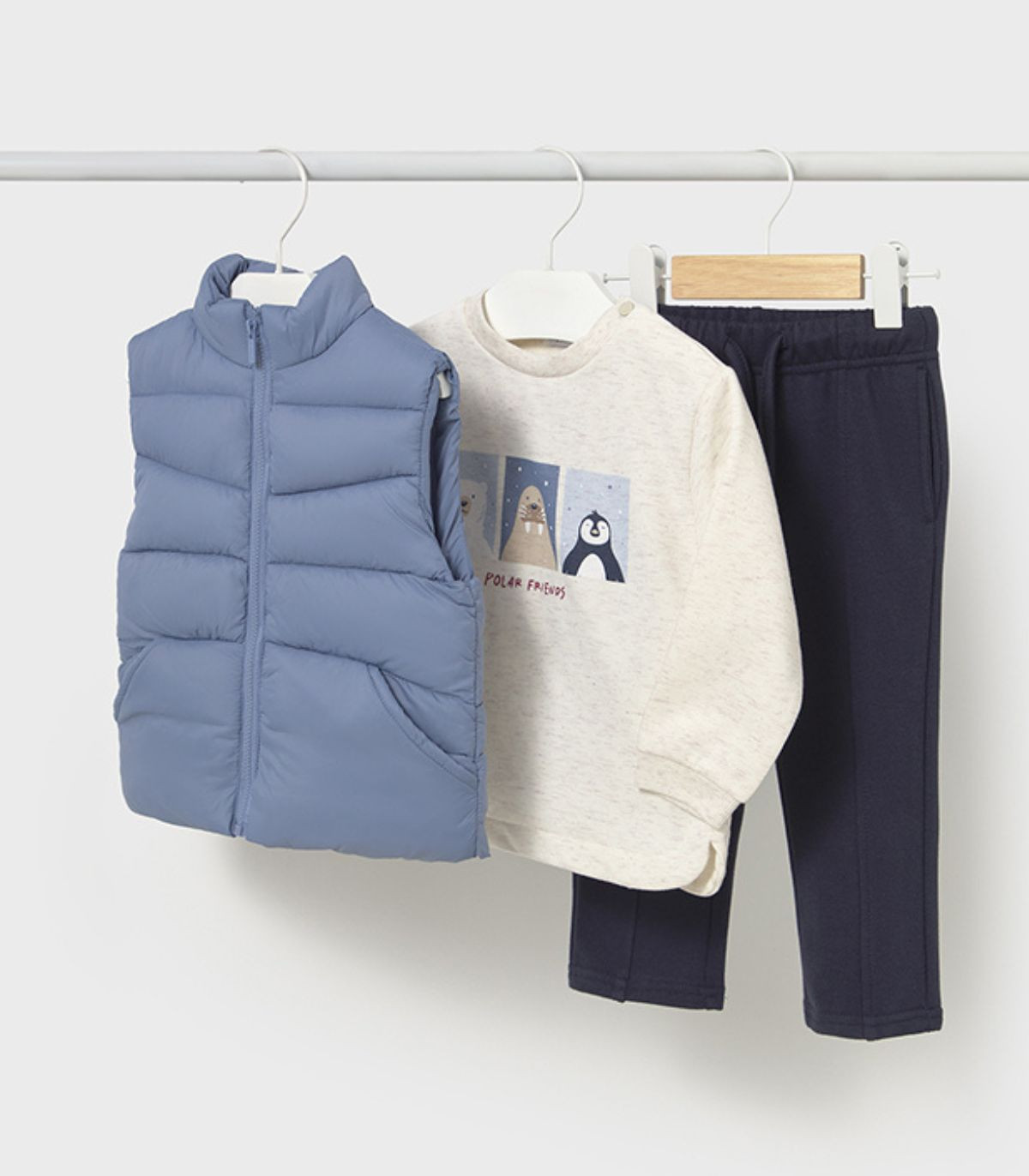 Conjunto de tres piezas para niño de Mayoral, ideal para la temporada otoño-invierno. Incluye un chaleco acolchado con cierre de cremallera en la parte delantera y bolsillos funcionales, perfecto para ir bien calentitos. La sudadera de manga larga con cuello redondo incorpora prácticos cierres a presión en el hombro para facilitar la puesta y un divertido dibujo con motivo infantil en el delantero. Completa el conjunto un pantalón confeccionado en tejido suave y cómodo, con cinturilla elástica para un ajuste perfecto y bolsillos en la parte delantera. Un conjunto práctico y abrigado, ideal para el día a día.
