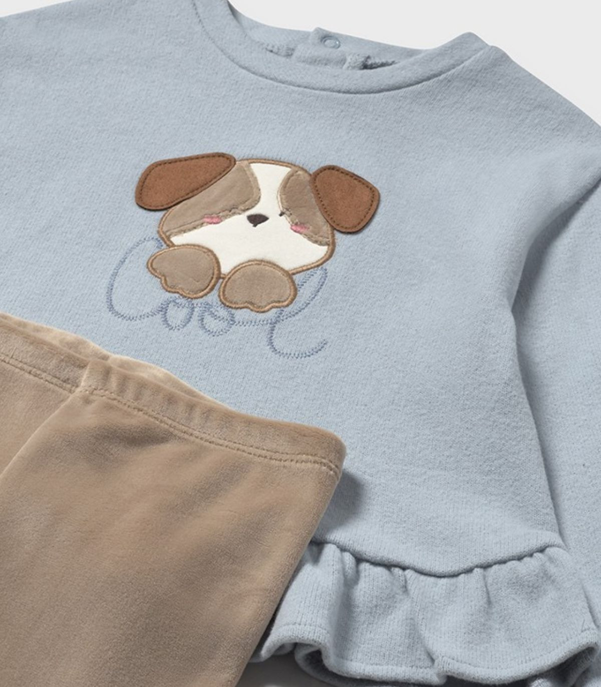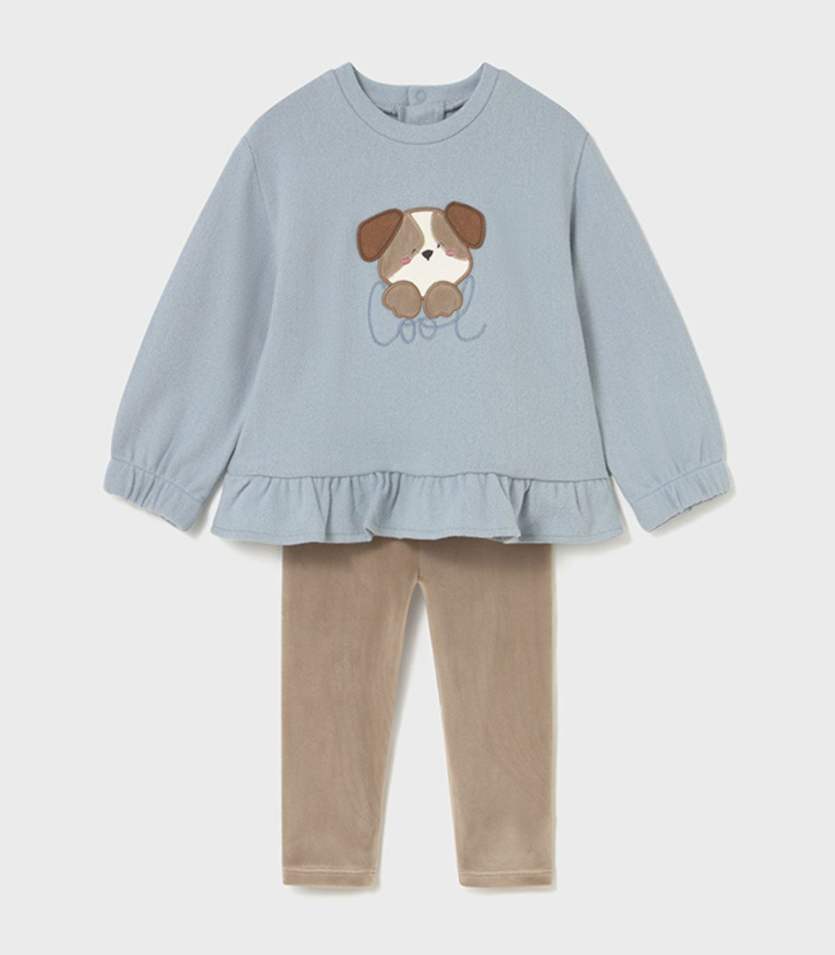 Conjunto de sudadera y legging para niña de Mayoral, perfecto para la temporada otoño-invierno. La sudadera de manga larga, con puños elásticos y cuello redondo, cuenta con práctica abertura en la espalda con cierres a presión para facilitar la puesta. Como detalles especiales, luce un bonito aplique bordado en el delantero y un delicado volante en el bajo que aporta un toque coqueto. El legging a juego, confeccionado en tejido suave, incorpora cintura elástica para un ajuste cómodo y perfecto. Un conjunto ideal para combinar estilo y confort en los días más frescos.