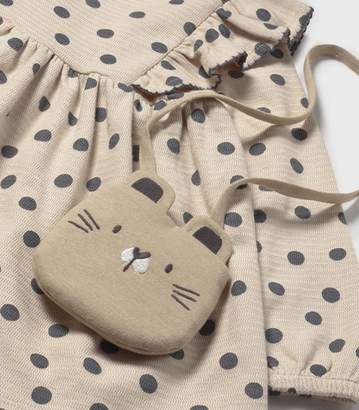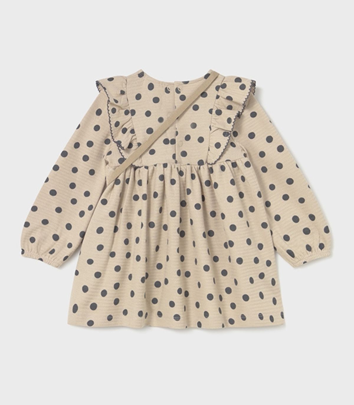 Vestido para niña de la colección otoño-invierno de Mayoral con bolsito a juego. Confeccionado en tejido suave, el vestido de manga larga con cuello redondo y puños elásticos se abrocha en la espalda con cierres a presión. Su alegre estampado de lunares aporta un toque divertido y original. Completa el conjunto un práctico y coqueto bolso a juego, ideal para crear un look cómodo y encantador en los días fríos.