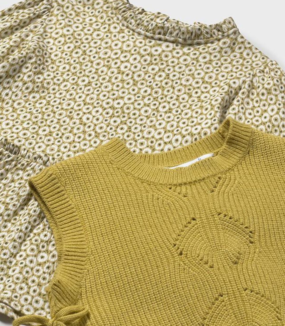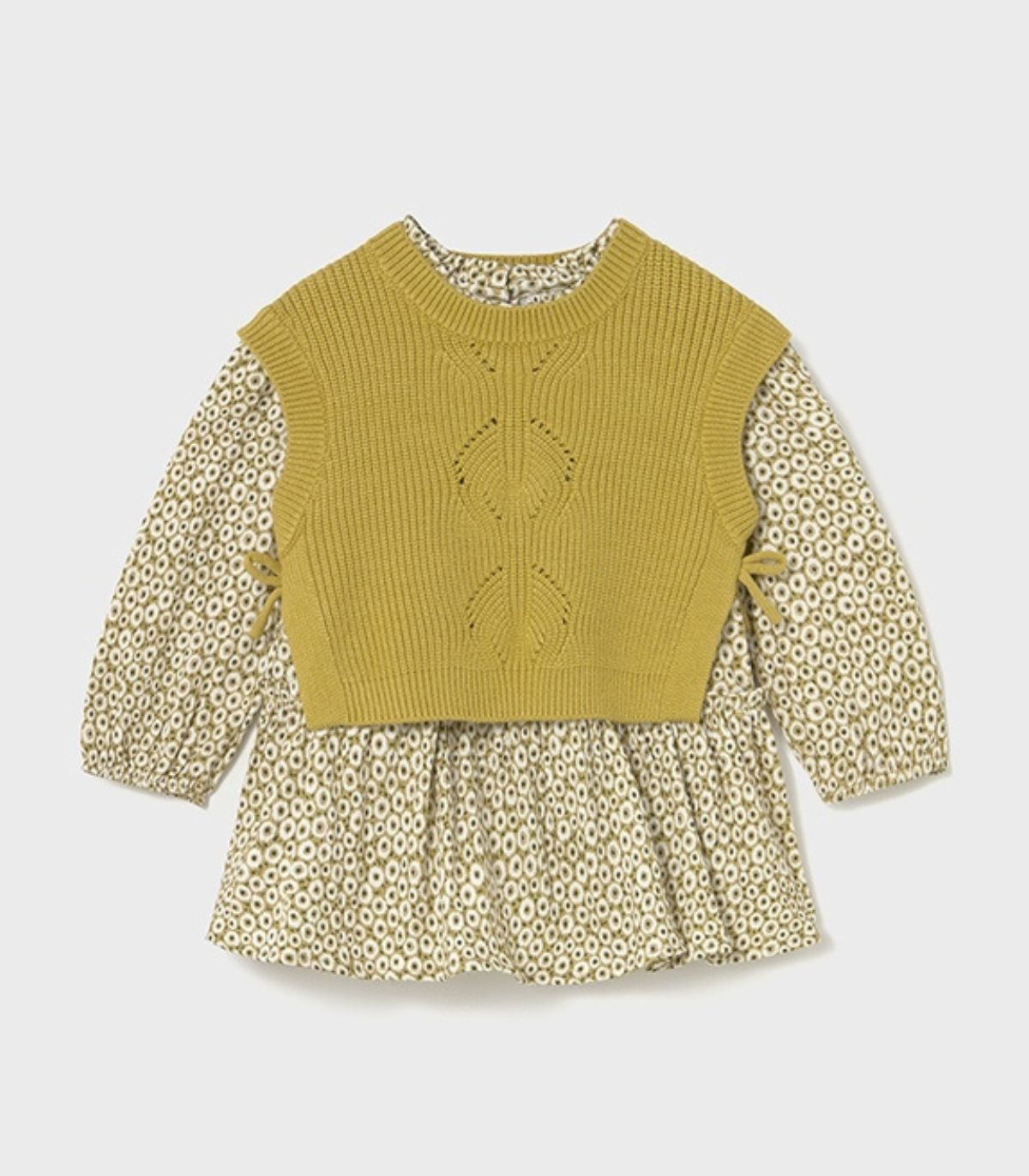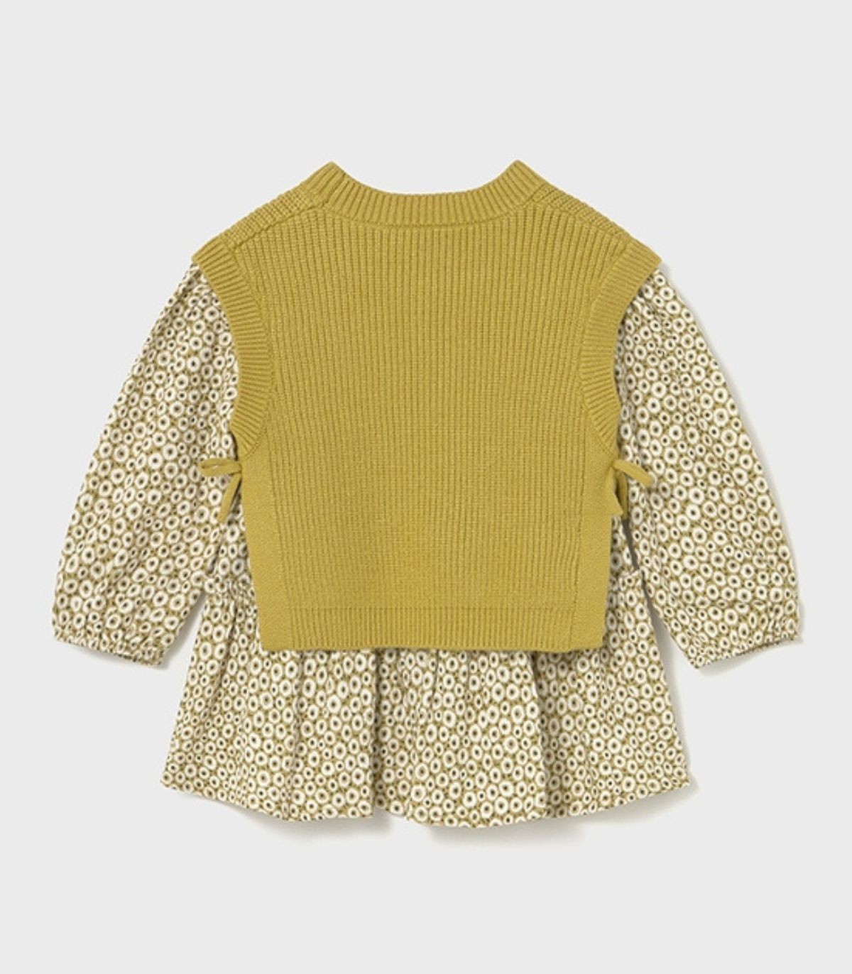 Vestido con chaleco para niña de la colección otoño-invierno de Mayoral. El vestido, de manga larga y cuello redondo, está confeccionado en un suave tejido con un bonito estampado que aporta dulzura y estilo. A juego, incluye un chaleco en punto tricot muy coqueto, que se anuda a los lados con un delicado lacito, completando así un look cómodo y elegante para los días más frescos.