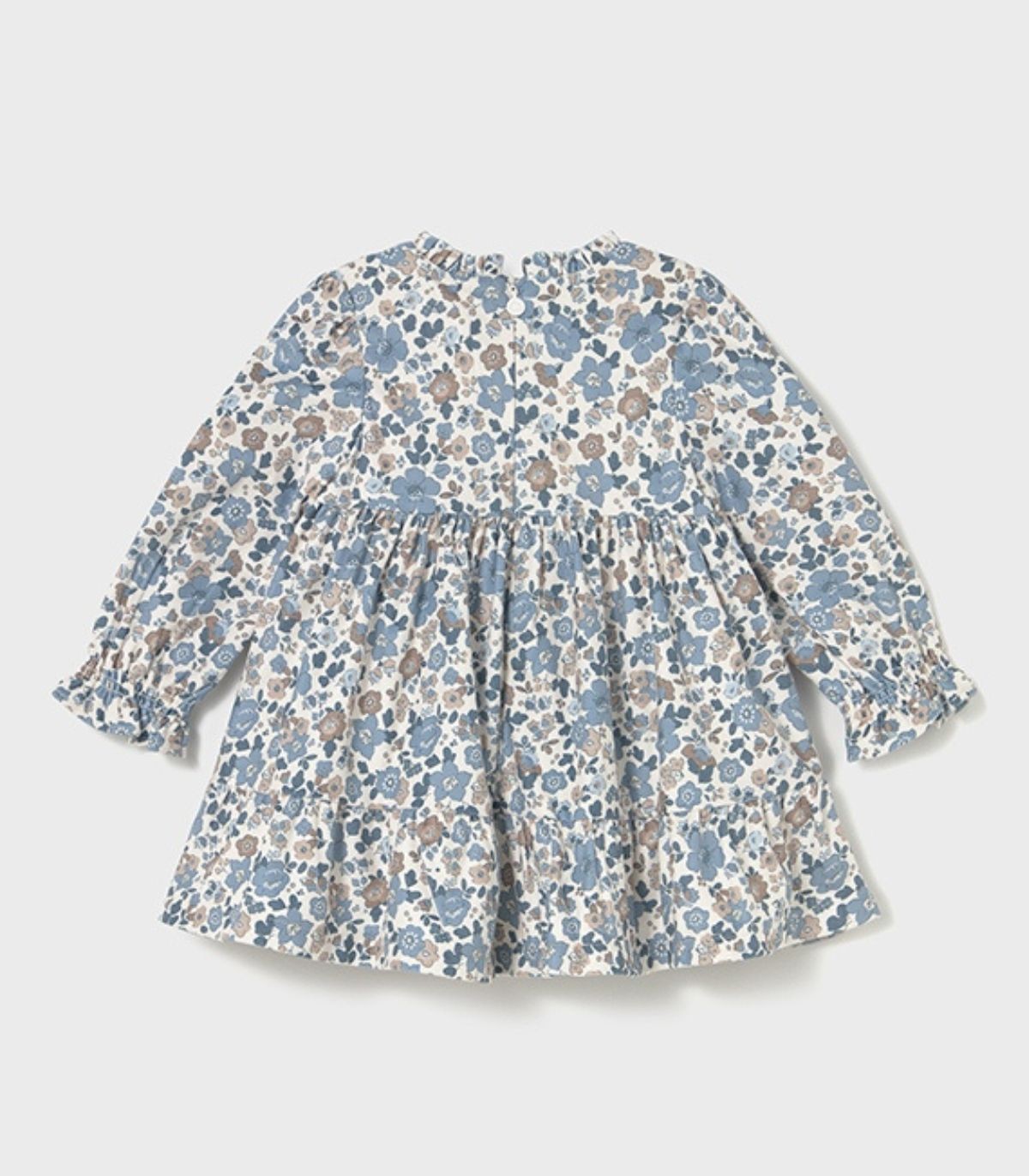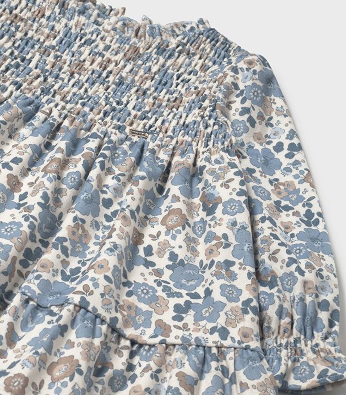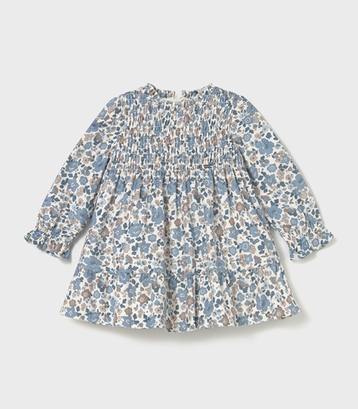 Vestido para niña de la colección otoño-invierno de Mayoral, confeccionado en un suave tejido con un precioso estampado de flores en tonos azules. El vestido, de manga larga y cuello redondo, se abrocha en la parte trasera con cierre de cremallera para mayor comodidad. Como detalles, presenta un delicado fruncido tipo nido de abeja en el delantero y un volante en el bajo, que aportan un aire elegante y muy coqueto, ideal para los días más especiales de la temporada.