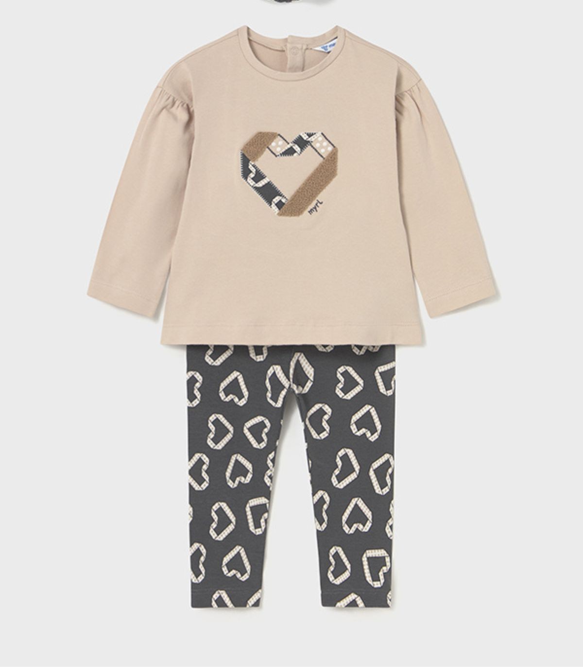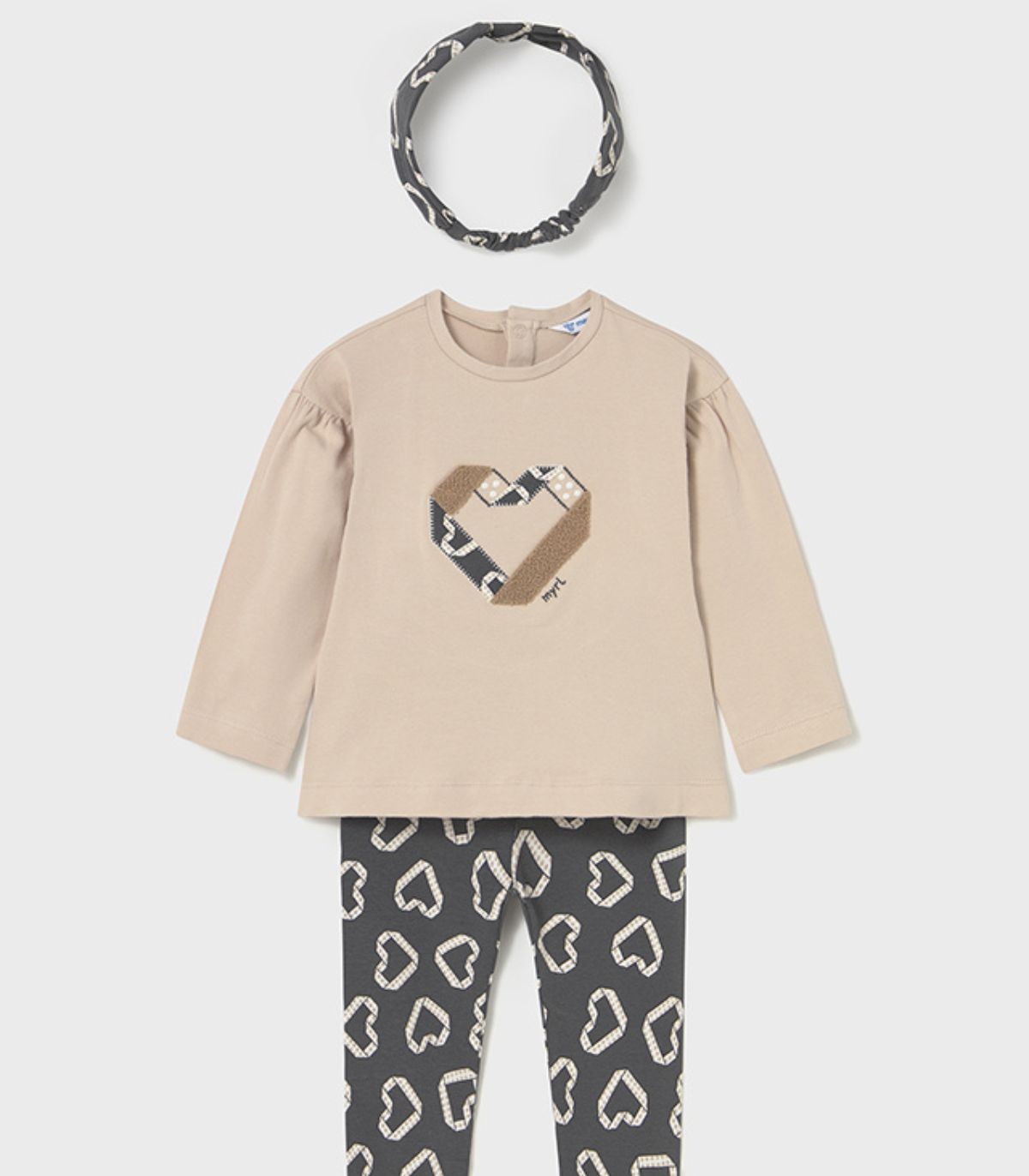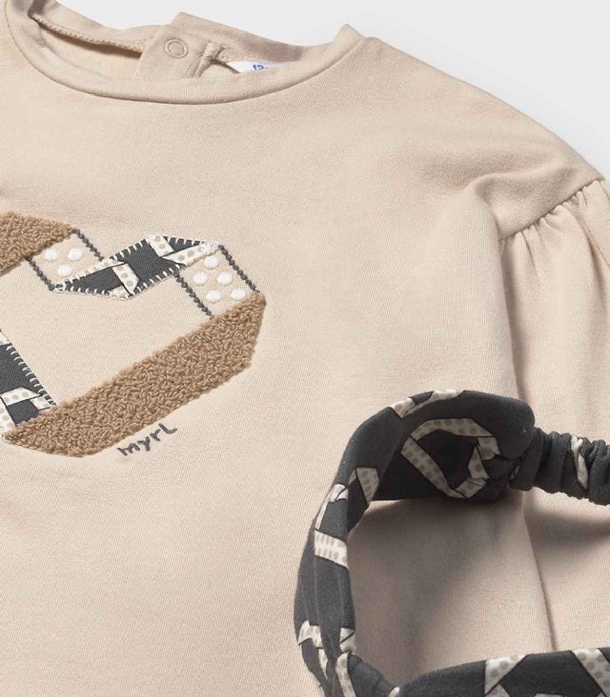 Conjunto con diadema a juego para niña de la colección otoño-invierno de Mayoral, confeccionado en tejido suave y cómodo ideal para la temporada. La sudadera, de manga larga y cuello redondo, luce un delicado aplique en el centro del delantero que aporta un toque encantador. El pantalón tipo legging, con un alegre estampado a juego, incorpora cintura elástica para un ajuste perfecto y confortable. Completa el conjunto una bonita diadema de tela en el mismo estampado del pantalón, que aporta el detalle final para un look coordinado y lleno de estilo.