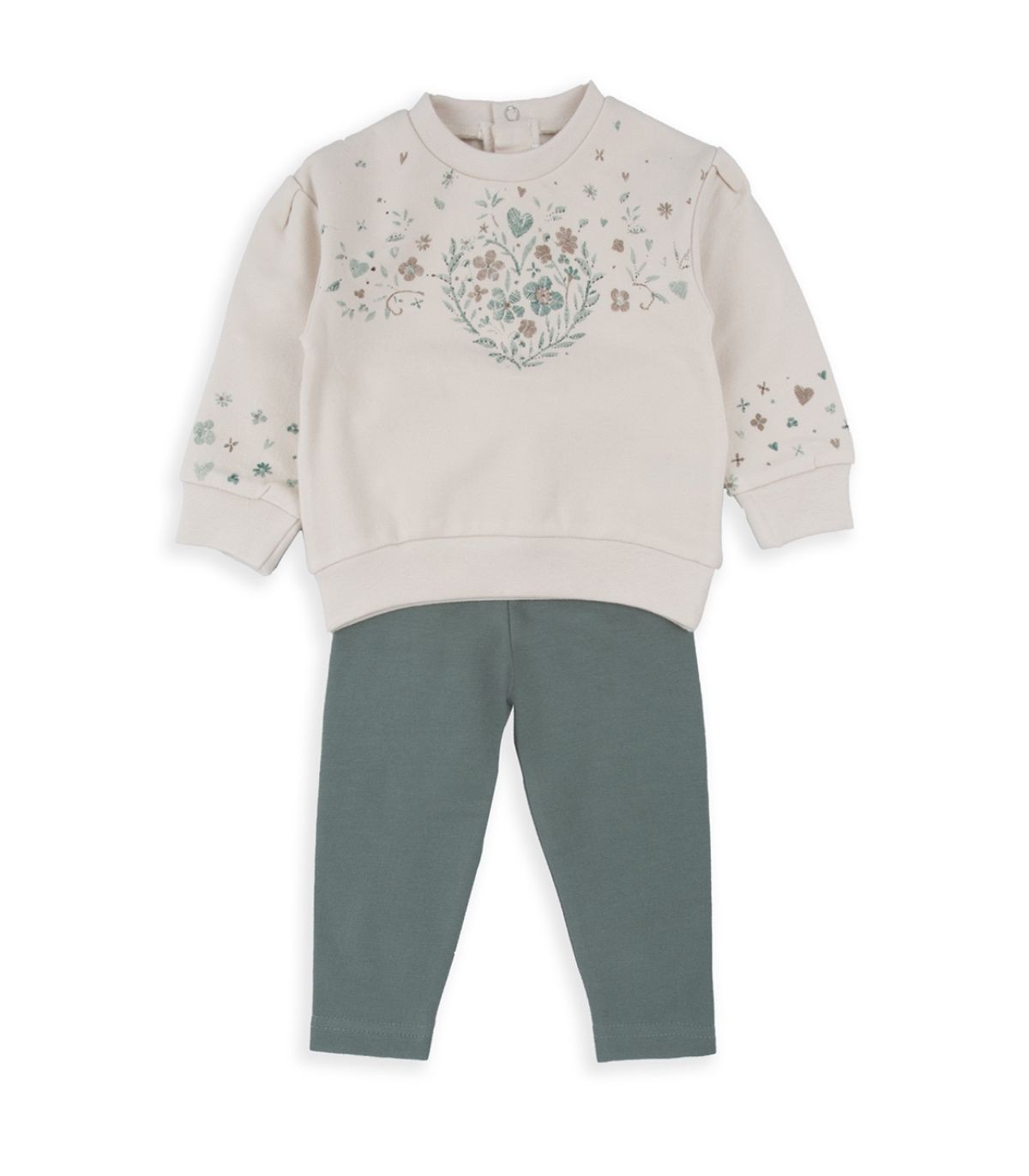 Conjunto de sudadera y legging para niña de la colección otoño-invierno, confeccionado en tejido suave y cómodo, ideal para el día a día. La sudadera de manga larga con cuello redondo destaca por su bonito estampado en el delantero y cuenta con una práctica abertura en la espalda con cierre a presión para facilitar la puesta. El legging a juego, con cintura elástica, garantiza un ajuste cómodo y perfecto. Un conjunto versátil y cálido, ideal para la temporada.