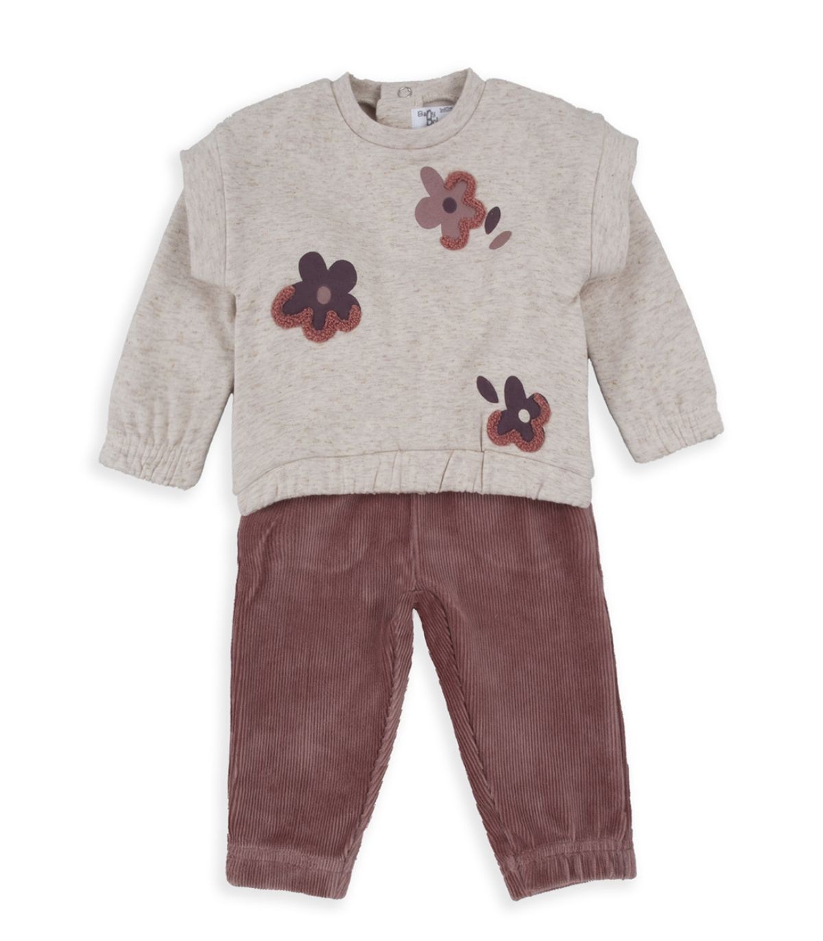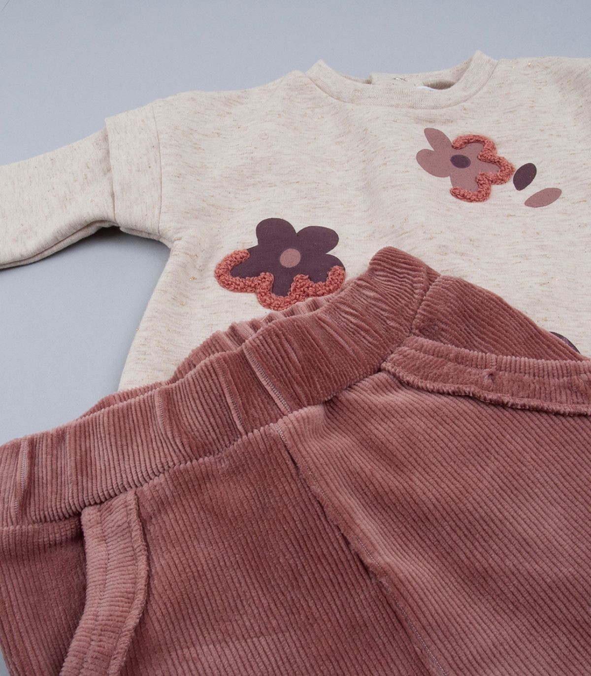 Conjunto de sudadera y legging para niña de la colección otoño-invierno, confeccionado en tejido suave y cómodo para los días más fríos. La sudadera de manga larga con cuello redondo lleva una pequeña abertura en la espalda con cierres a presión que facilitan la puesta, y luce un bonito diseño con dibujo y bordado de flores en el delantero. A juego, el pantalón tipo legging, confeccionado en tejido de pana muy blandito, cuenta con cintura elástica para un ajuste perfecto y dos prácticos bolsillos en la parte delantera. Un conjunto ideal que combina comodidad y estilo.