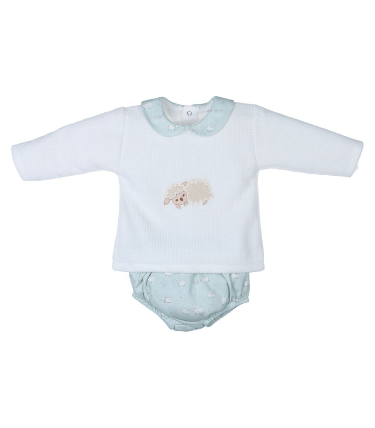 Conjunto de sudadera y ranita para bebé de la colección otoño invierno. La sudadera en tono blanco, de manga larga y cuello bebé, lleva como detalle un delicado aplique bordado de una ovejita en el delantero y se abrocha en la espalda con prácticos cierres a presión para facilitar la puesta. A juego, la ranita en tono verde, confeccionada en tejido muy suave con estampado de ovejitas, incorpora elástico para garantizar un ajuste cómodo y perfecto.