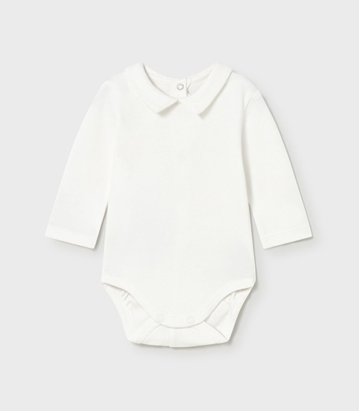 El conjunto se complementa con un body de manga larga y cuello bebé, diseñado en un tejido suave y transpirable, que se abrocha en la parte inferior para facilitar el cambio de pañal.