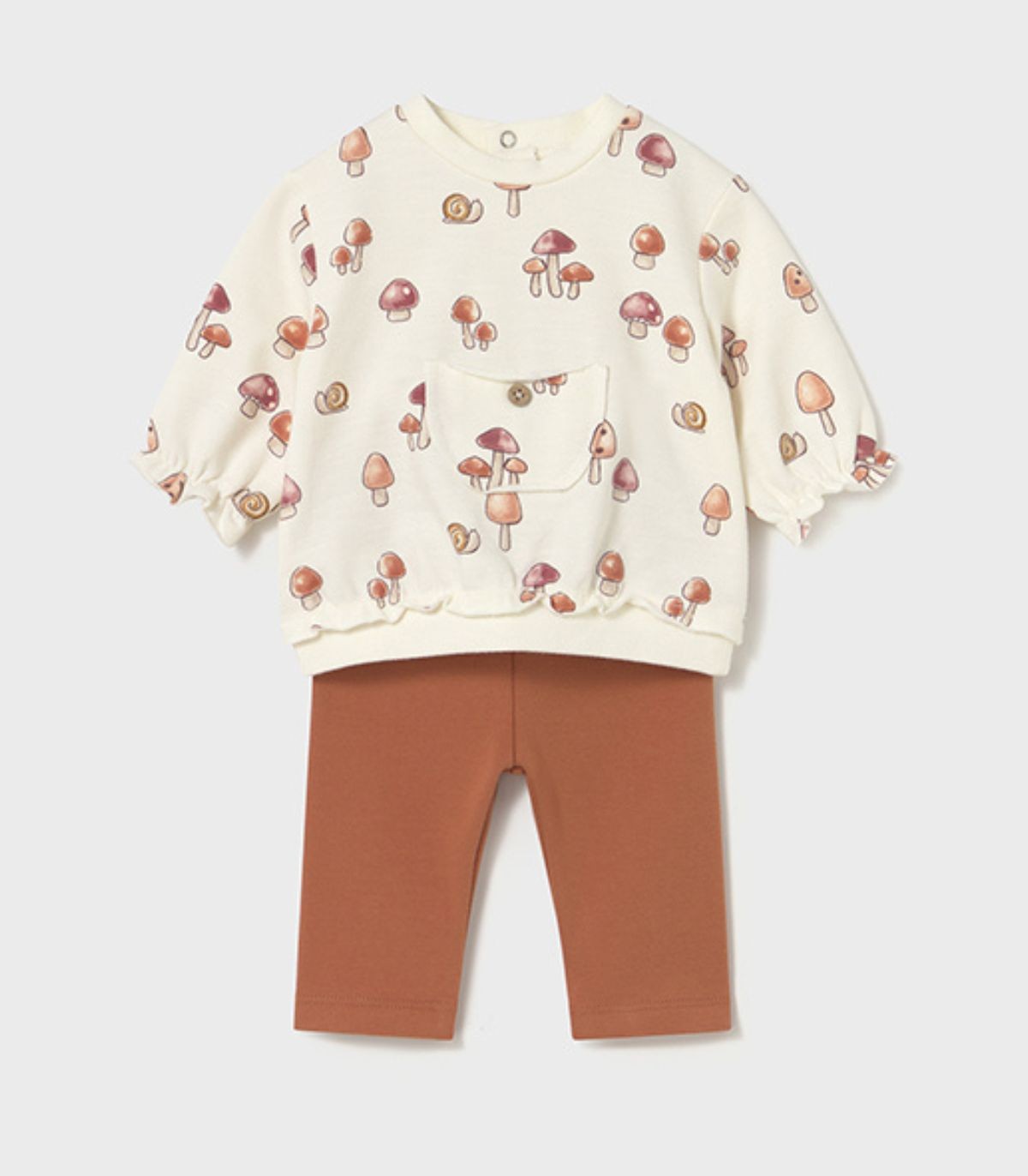Conjunto de leggings y sudadera para bebé niña de la colección otoño invierno de Mayoral, confeccionado en tejido suave y confortable. La sudadera de manga larga con cuello redondo y puños elásticos ofrece un estilo práctico y cómodo para el día a día. El legging a juego, con cintura elástica, garantiza un ajuste perfecto y gran libertad de movimiento. Un conjunto ideal para la temporada, combinando calidez y dulzura.