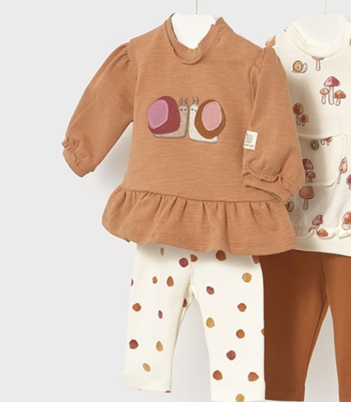 Conjunto de leggings y sudadera para bebé niña de la colección otoño invierno de Mayoral, confeccionado en tejido suave y confortable. La sudadera de manga larga con cuello redondo y puños elásticos ofrece un estilo práctico y cómodo para el día a día. El legging a juego, con cintura elástica, garantiza un ajuste perfecto y gran libertad de movimiento. Un conjunto ideal para la temporada, combinando calidez y dulzura.