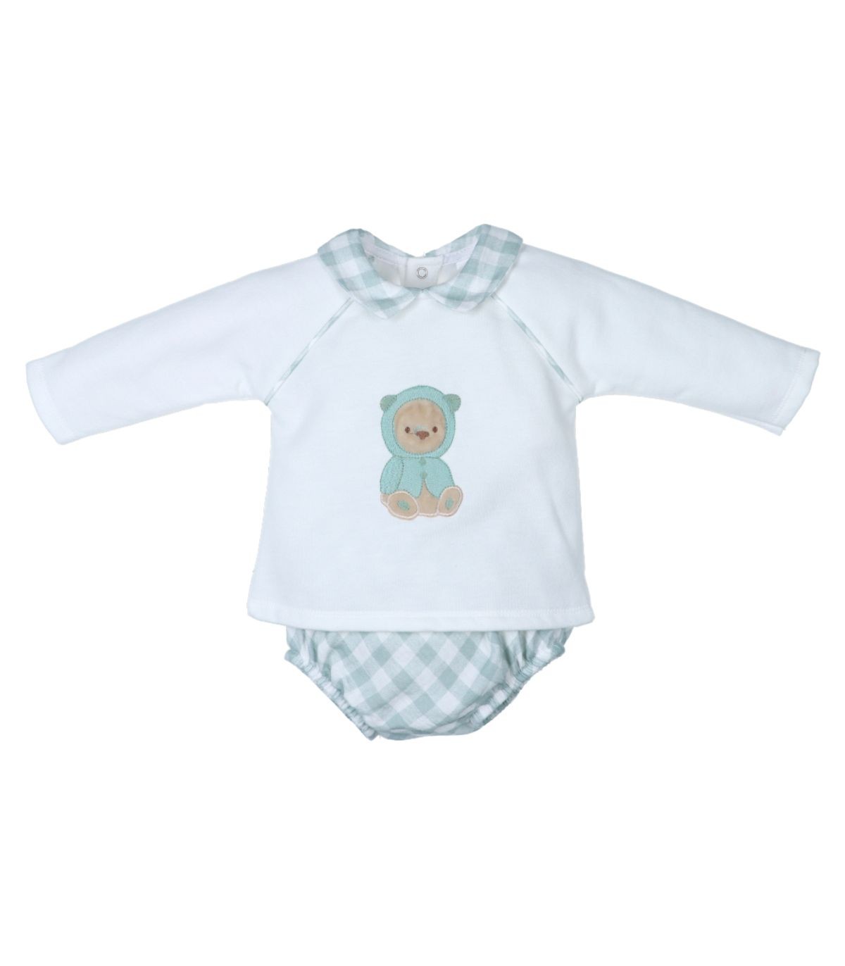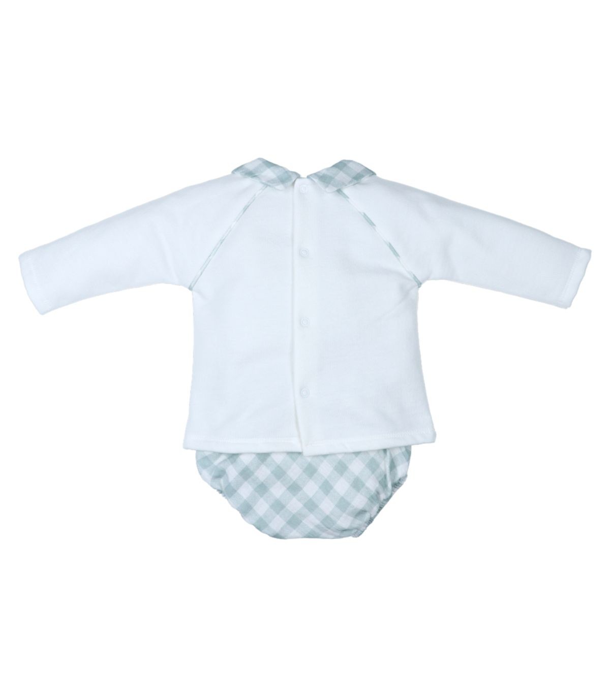 Conjunto de sudadera y ranita para bebé de la colección otoño invierno. La sudadera en tono blanco, de manga larga y cuello bebé, lleva como detalle un delicado aplique bordado en el delantero y se abrocha en la espalda con prácticos cierres a presión para facilitar la puesta. A juego, la ranita en tono verde, confeccionada en tejido muy suave con estampado Vichy en tono verde mint, incorpora elástico para garantizar un ajuste cómodo y perfecto.
