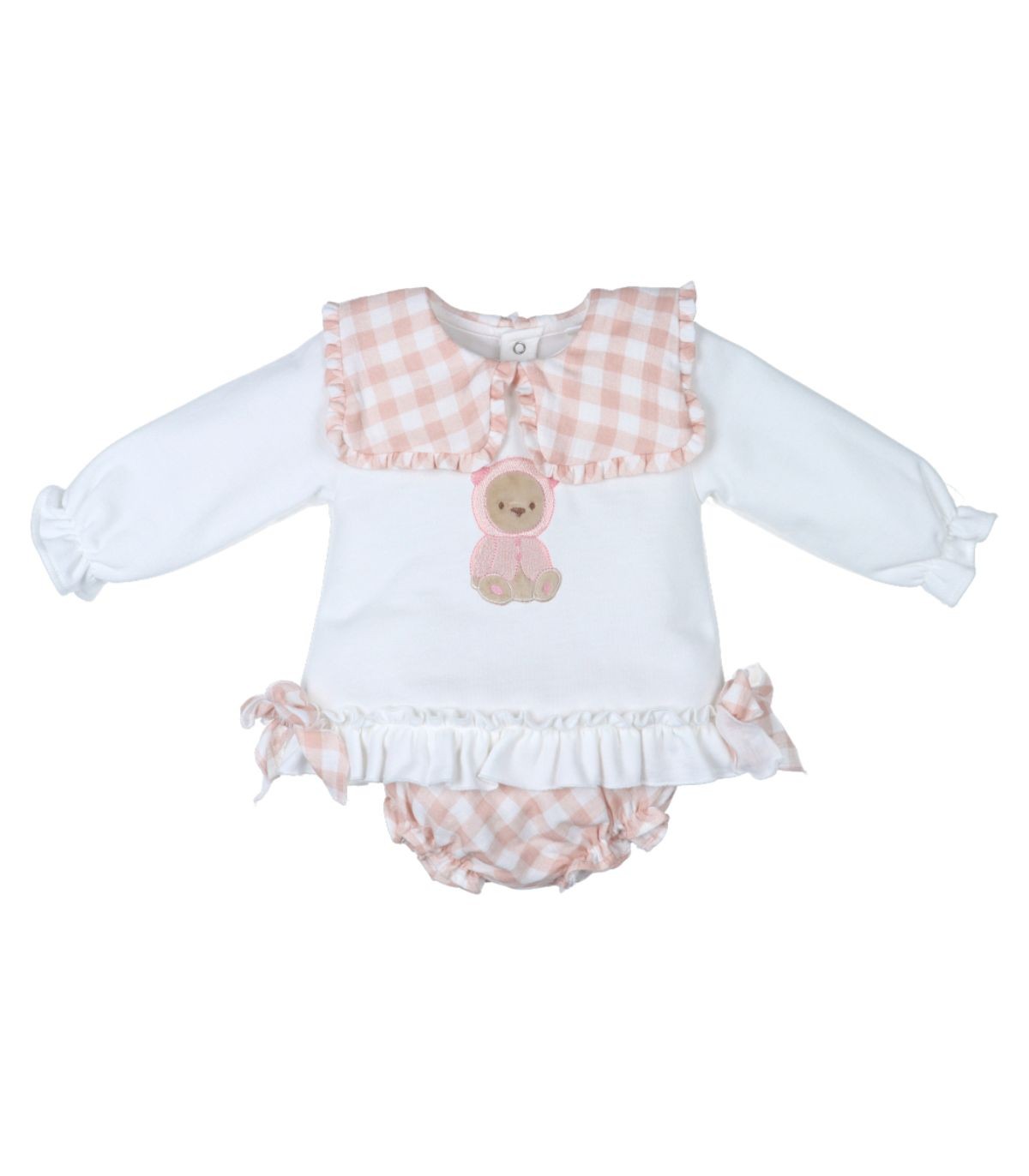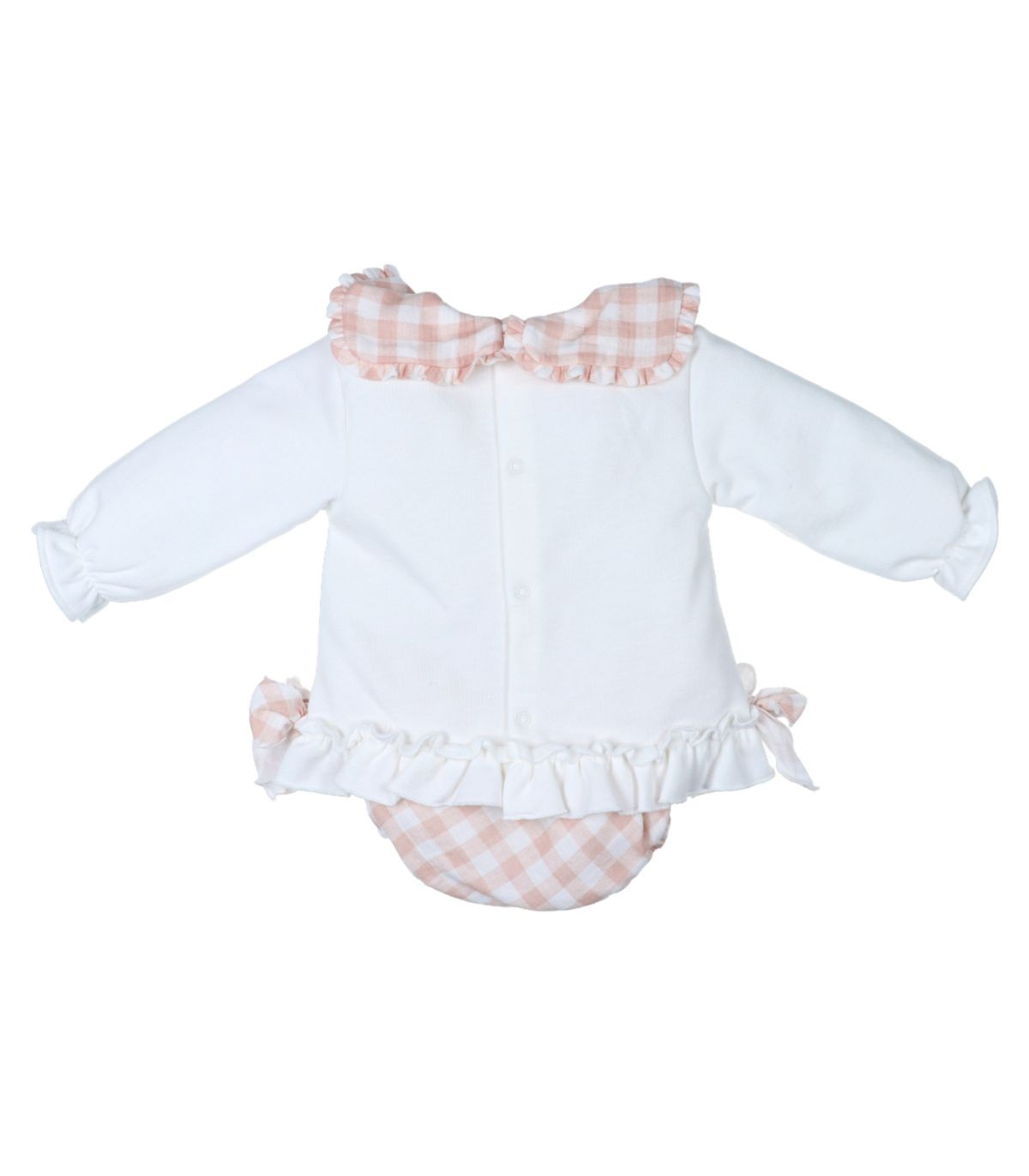Conjunto de sudadera y ranita para bebé de la colección otoño invierno. La sudadera en tono blanco, de manga larga y cuello cuadrado, lleva como detalle un delicado aplique bordado en el delantero y se abrocha en la espalda con prácticos cierres a presión para facilitar la puesta. A juego, la ranita confeccionada en tejido muy suave con estampado Vichy en tono rosa empolvado, incorpora elástico para garantizar un ajuste cómodo y perfecto.