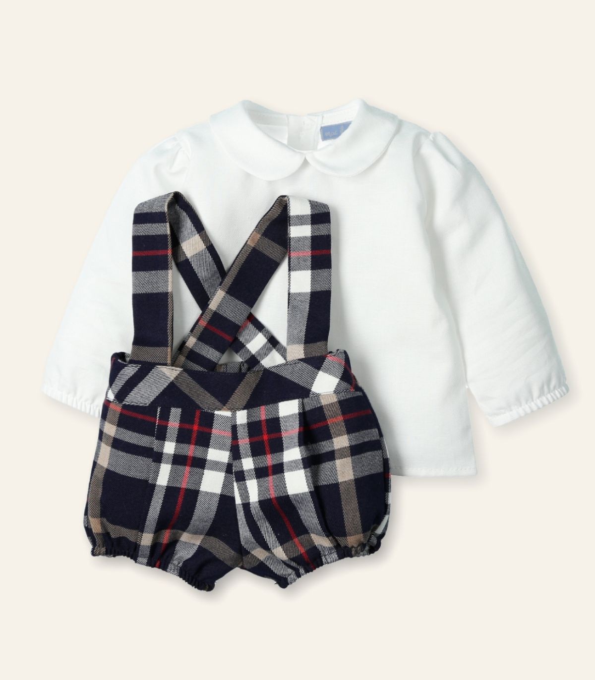 Conjunto de peto y camisa para bebé niño de la colección Yucca de otoño invierno, ideal para ocasiones especiales con un toque clásico y elegante. El peto está confeccionado en tejido de estampado tartán, con tirantes que se abrochan en la espalda para un ajuste cómodo y seguro. La camisa, en suave viella de tono blanco, lleva cuello bebé y se abrocha en la parte trasera con botones, facilitando la puesta. Un conjunto cálido y con mucho estilo para los más pequeños.