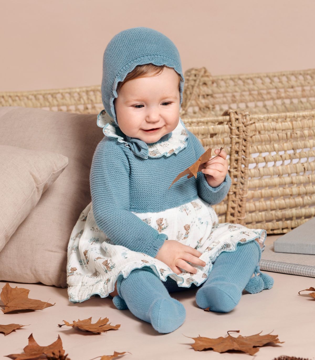 Vestido para niña de la colección otoño invierno de Juliana, confeccionado en una elegante combinación de punto tricot y tejido con estampado infantil. De manga larga y cuello redondo con un delicado volante que le aporta un toque tierno y distinguido. Se abrocha en la espalda con botones para mayor comodidad. El vestido va completamente forrado, ofreciendo suavidad y abrigo, perfecto para los días fríos de la temporada.