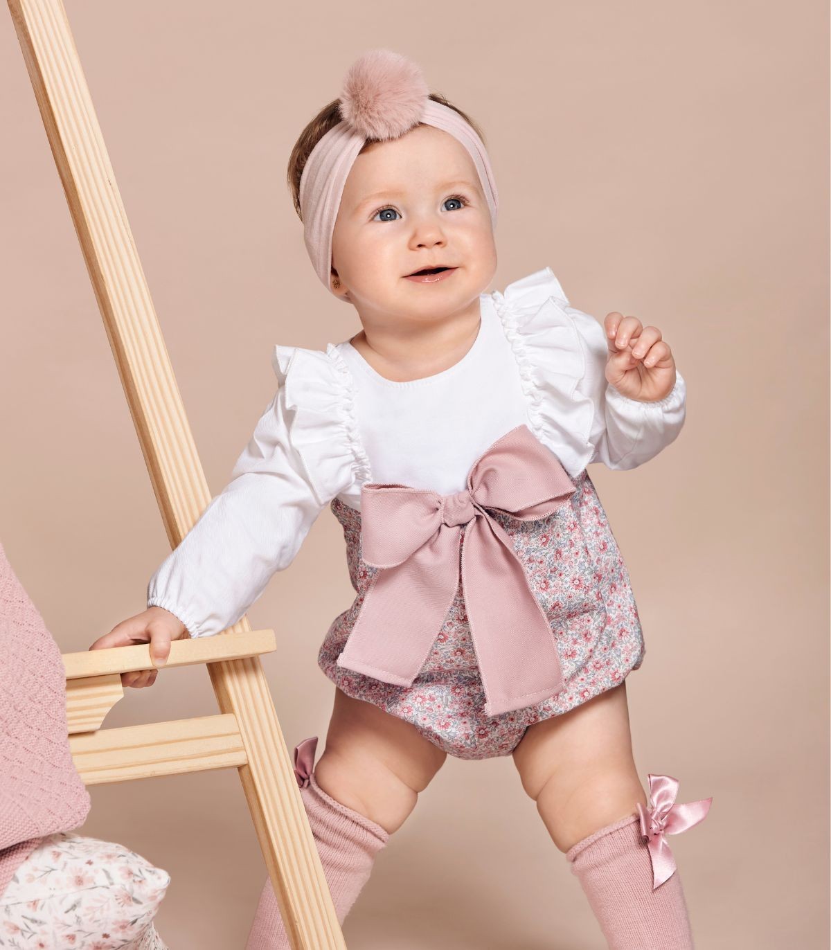 Pelele para bebé niña de la colección otoño invierno, con cuello redondo y un diseño que combina dos tejidos. La parte superior en tono blanco se une a la parte inferior confeccionada en un delicado estampado tipo liberty en tonos rosas. Como detalle, un bonito lazo en rosa empolvado adorna la parte delantera. Se abrocha en la espalda y cuenta con abertura en el bajo para facilitar el cambio de pañal.