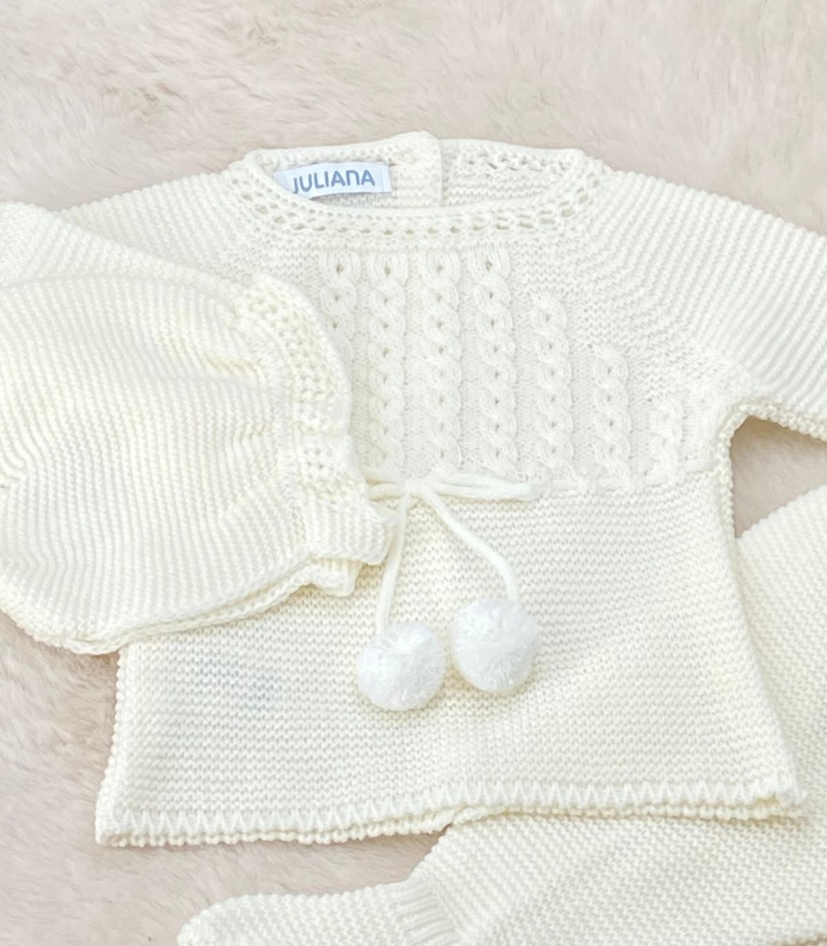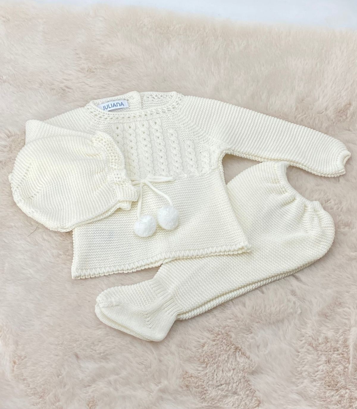 Conjunto ideal de primera puesta para bebé. Este encantador conjunto de jubón, polaina y capota a juego en punto tricot es perfecto para recibir a tu pequeño. Diseñado para brindar calidez y comodidad durante los primeros meses de vida. Confeccionado en España con materiales de alta calidad.