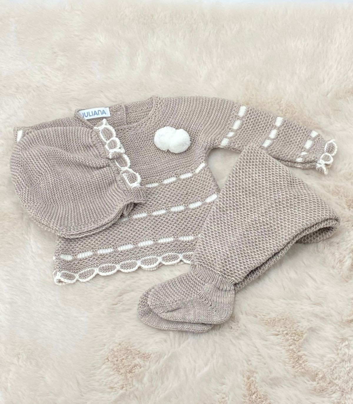 Conjunto ideal de primera puesta para bebé. Este encantador conjunto de jubón, polaina y capota a juego en punto tricot es perfecto para recibir a tu pequeño. Diseñado para brindar calidez y comodidad durante los primeros meses de vida. Confeccionado en España con materiales de alta calidad.