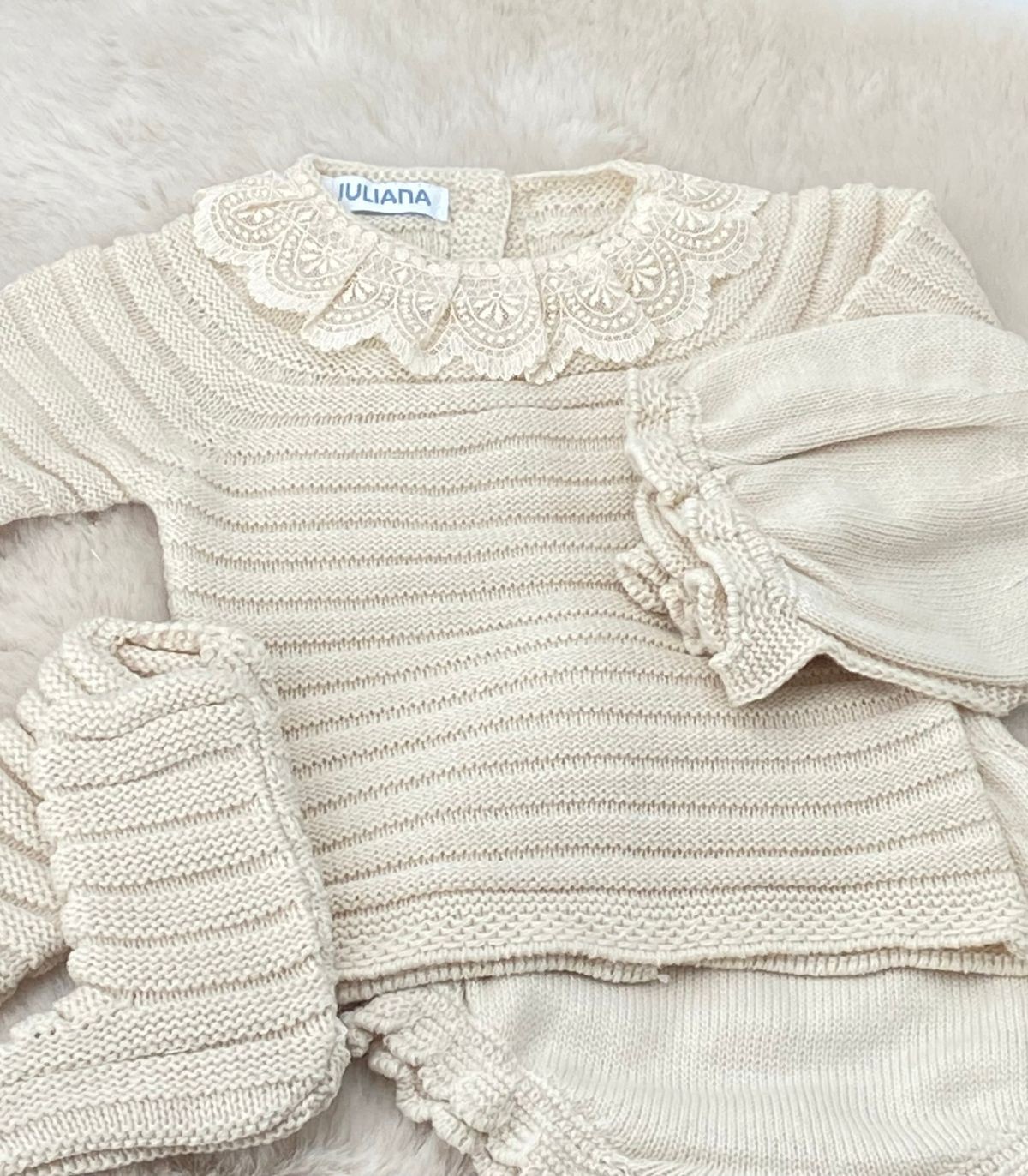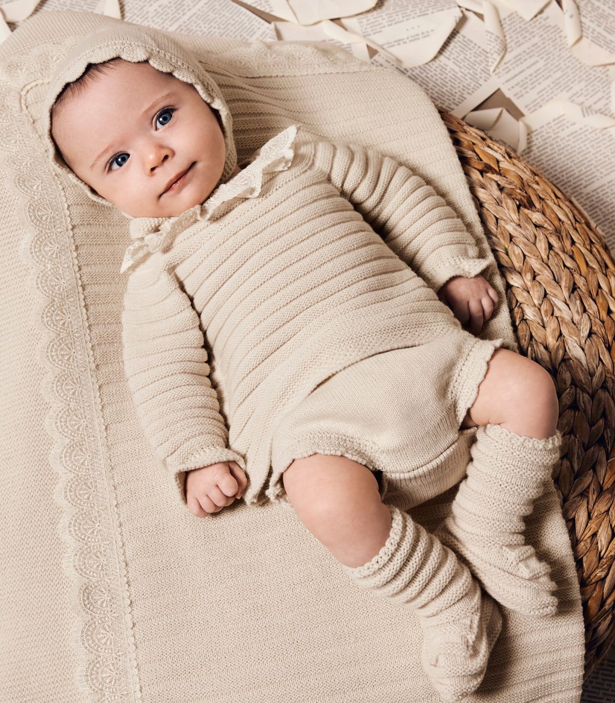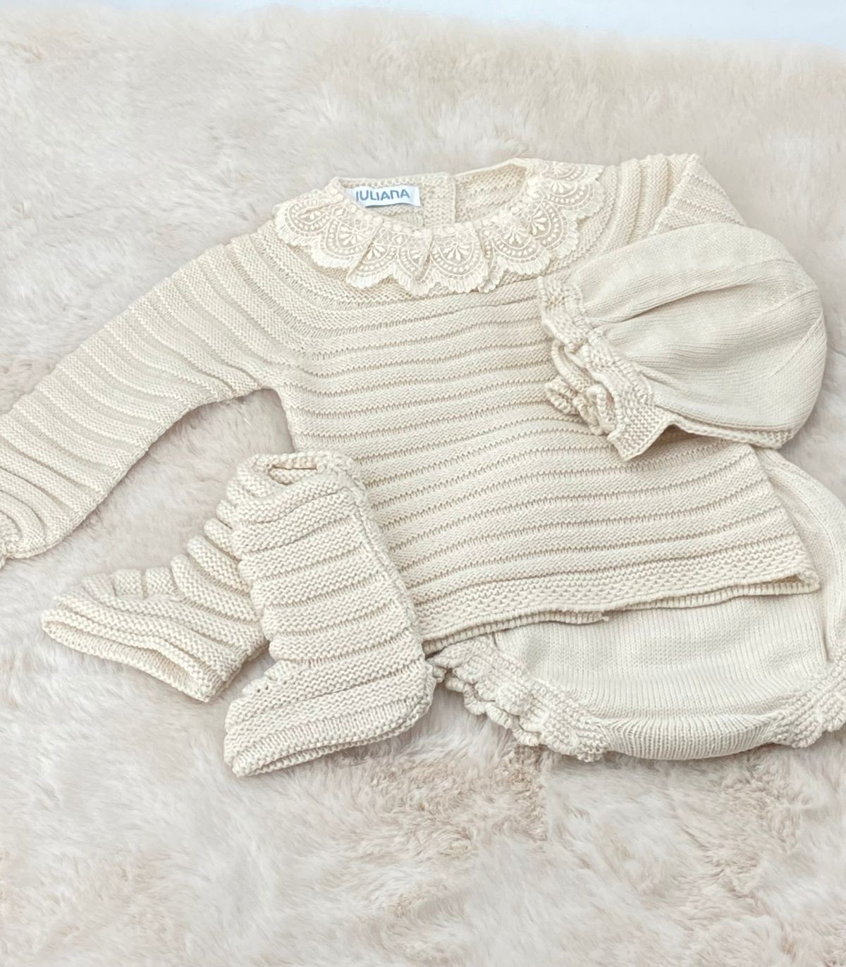 Conjunto de cuatro piezas para bebé confeccionado en punto en tono crema. El jubón de manga larga se abrocha en la espalda y lleva como detalle un volante de encaje en el cuello. A juego, la ranita, las botitas y la capota completan este conjunto ideal para las primeras puestas.