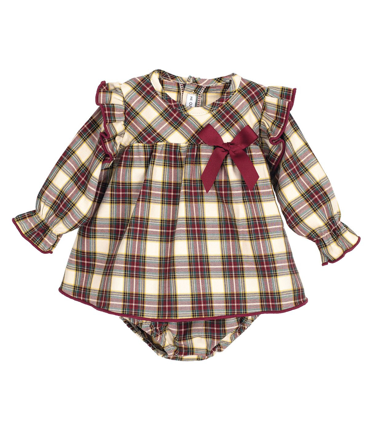 Conjunto jesusito y ranita para bebé niña de la colección Boreas de otoño invierno. Confeccionado en un precioso tejido de cuadros con aire totalmente navideño, ideal para las sesiones de fotos de Navidad. El jesusito, de manga larga, se abrocha en la espalda, y la ranita a juego, en el mismo tejido, lleva elástico para un ajuste cómodo y perfecto.