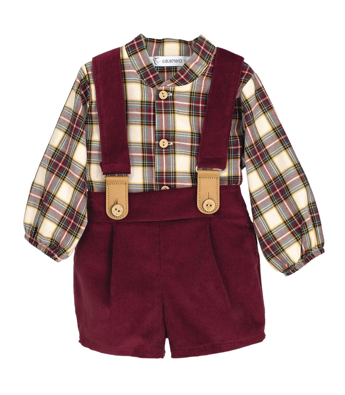 Conjunto de pololo y camisa para niño de la colección Boreas de otoño invierno. El pololo está confeccionado en suave tejido de micropana en tono rojo y lleva tirantes que se abrochan en la parte delantera con botones. La camisa, a juego, presenta un bonito estampado de cuadros tartán en tonos rojo, verde y crudo, y se abrocha en la parte delantera. Un conjunto ideal para las fiestas de Navidad y para las sesiones de fotos navideñas, con un estilo clásico y encantador perfecto para estas fechas.