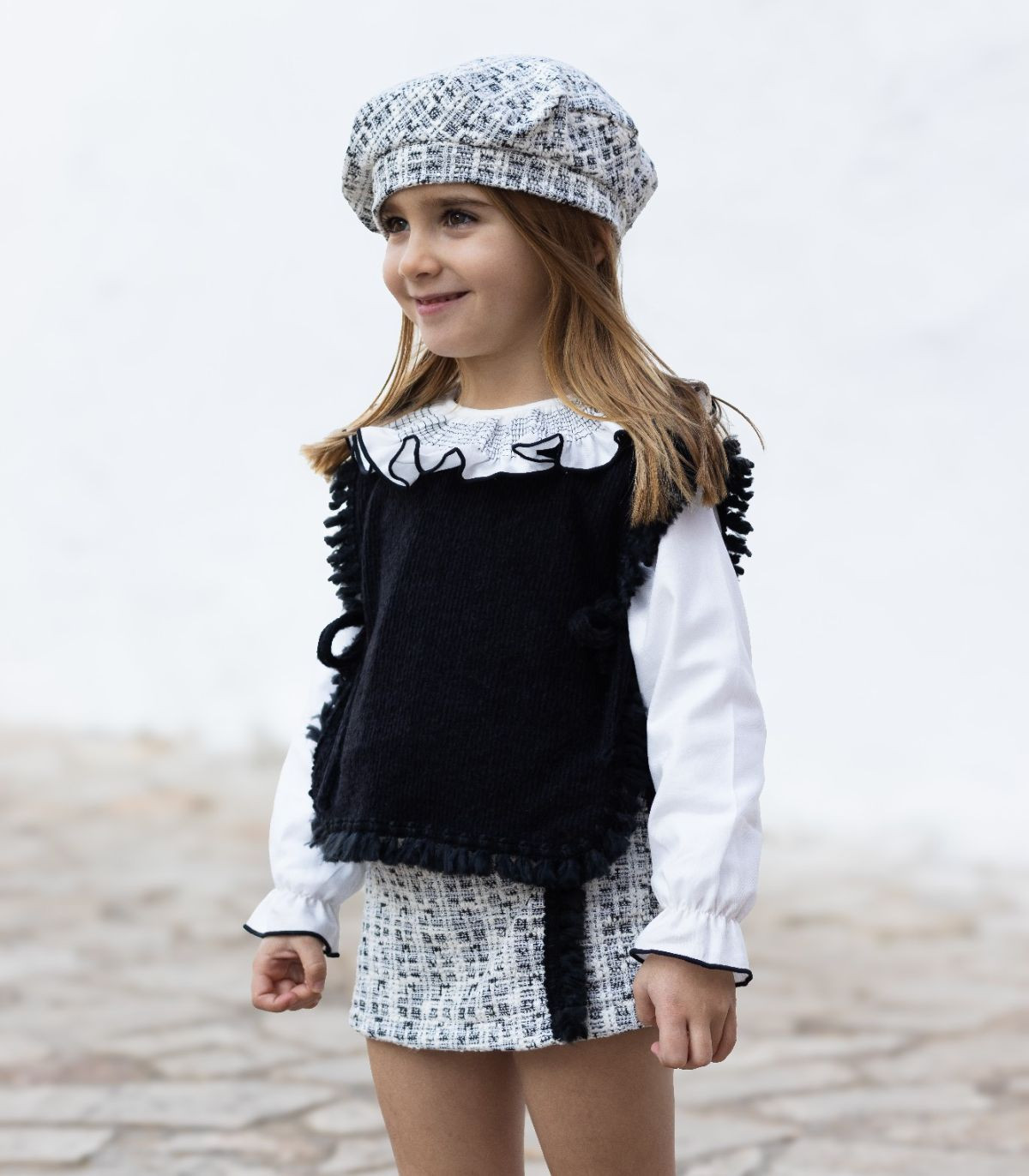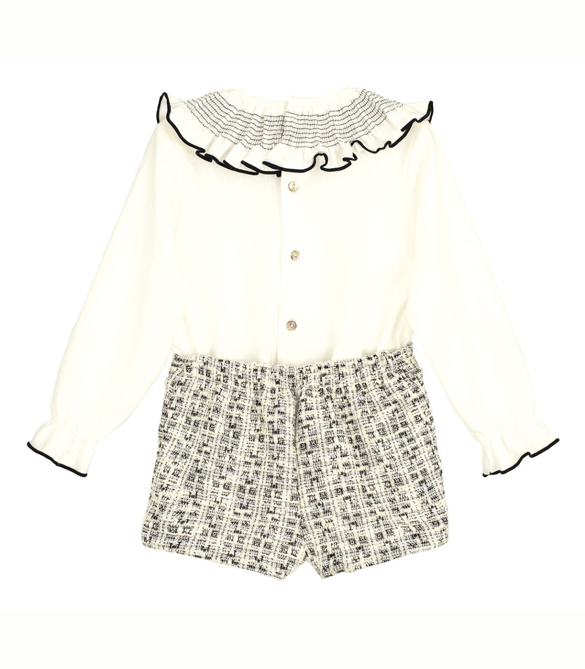 Conjunto Alisio de la colección otoño invierno, compuesto por falda-pantalón y blusa, ideal para ir a la moda sin renunciar a la comodidad. La blusa, de manga larga en tono blanco, destaca por su elegante cuello con volante y delicados frunces en color negro. La falda-pantalón a juego completa un conjunto cómodo, actual y con mucho estilo, perfecto para los días más especiales de la temporada.