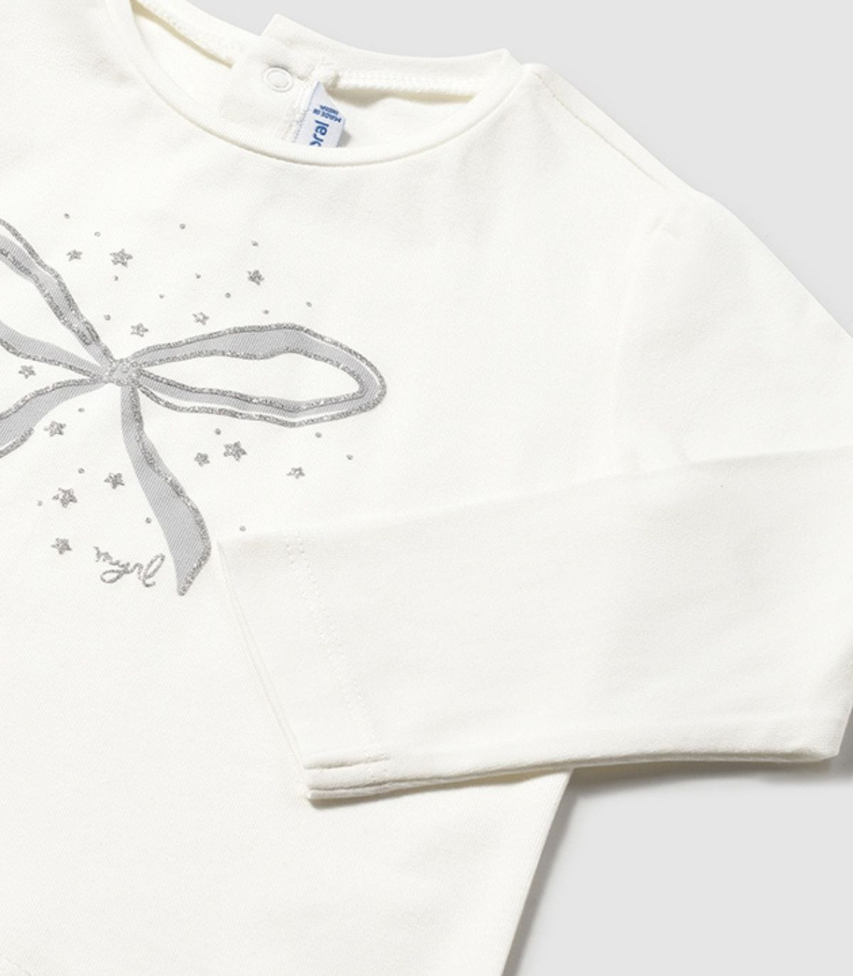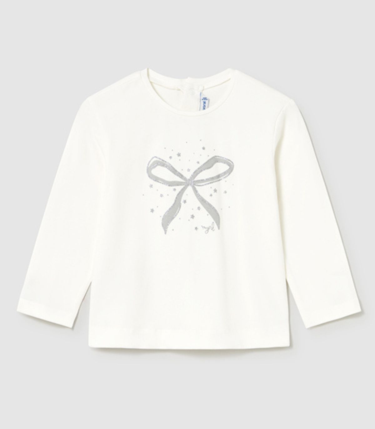 Camiseta básica para niña de la colección otoño invierno de Mayoral, de manga larga y cuello redondo, confeccionada en suave algodón para mayor comodidad. Se abrocha en la espalda con cierres a presión para facilitar la puesta. Como detalle, presenta un bonito estampado en el centro con lazo y estrellas, aportando un toque dulce y delicado.