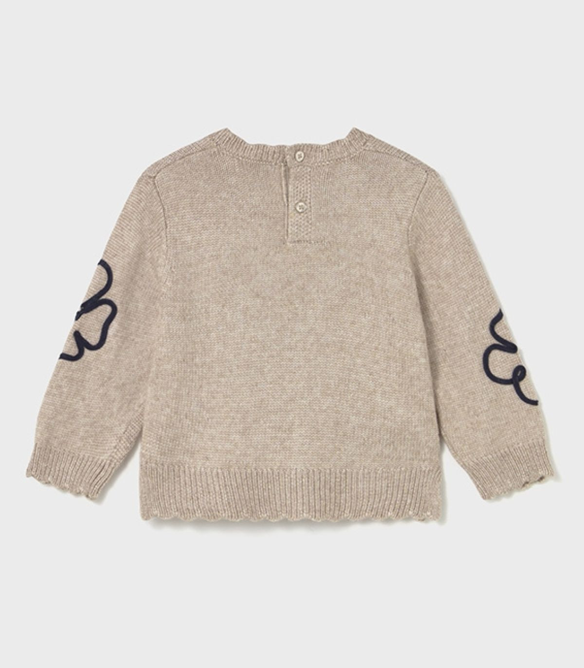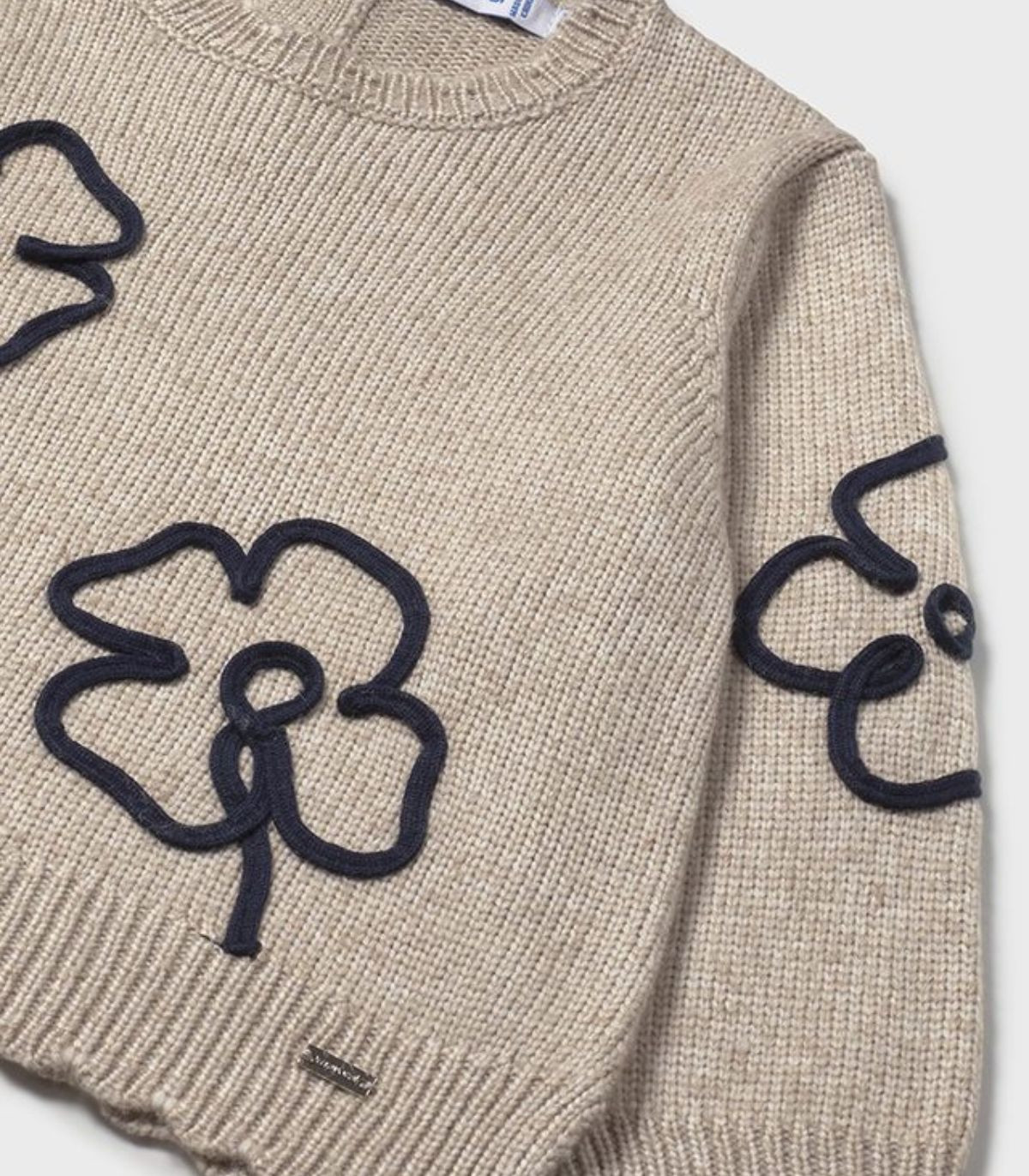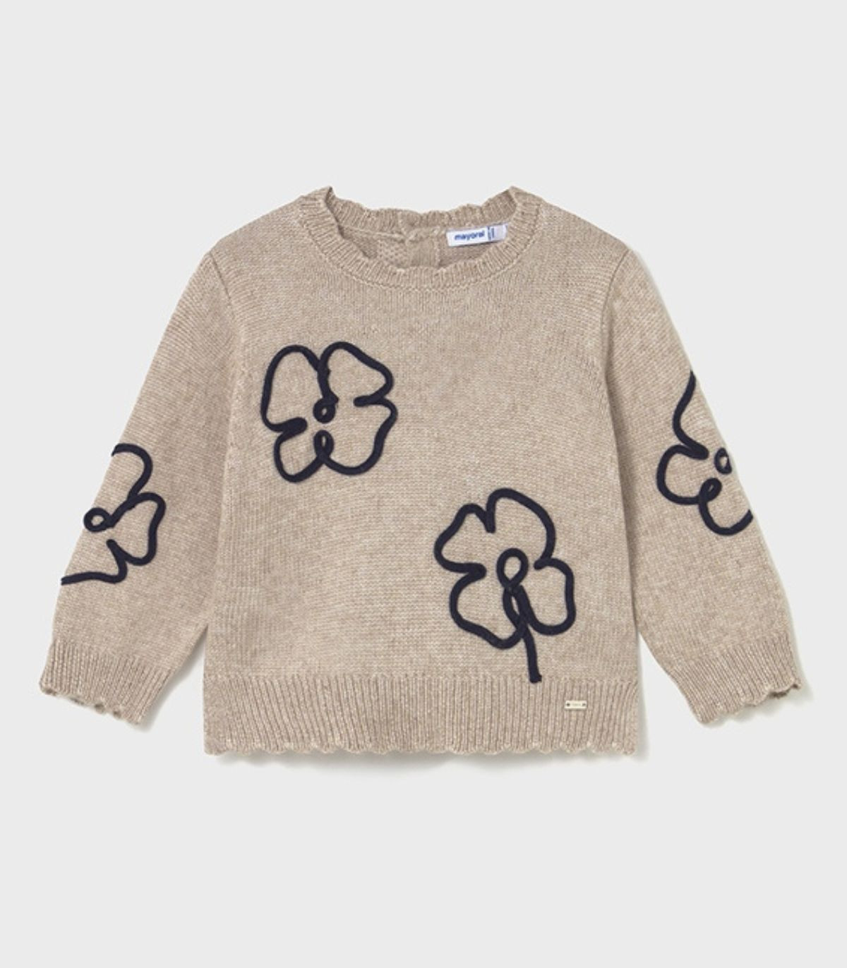Jersey para niña de la colección otoño invierno de Mayoral, confeccionado en suave punto tricot. De manga larga y cuello redondo con delicadas onditas en los bordes, se abrocha en la espalda con botones para facilitar la puesta. Como detalle, luce un bonito aplique en tono azul con forma de flores en la parte delantera, aportando un toque dulce y elegante.