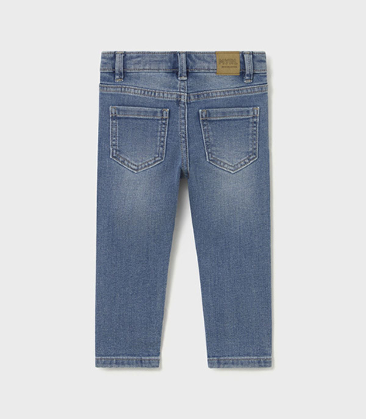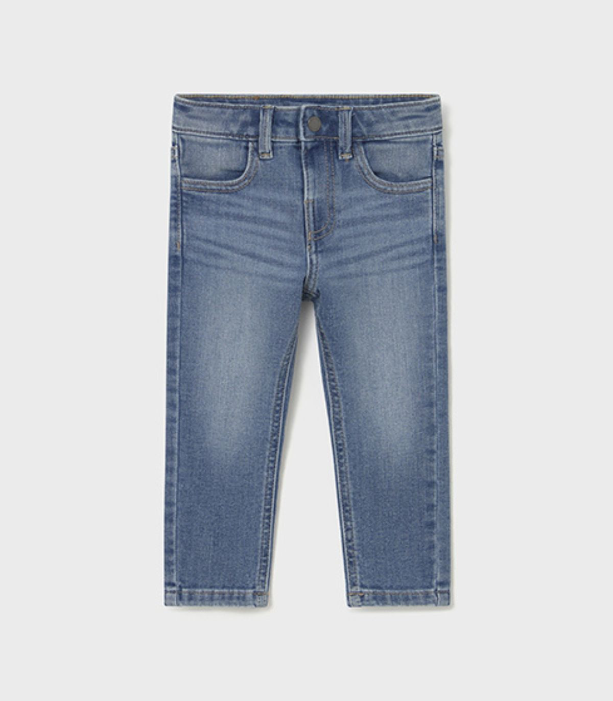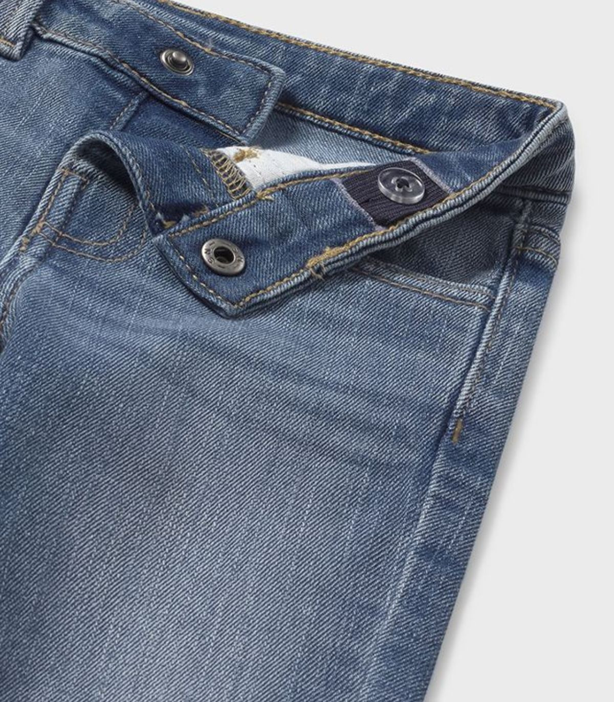 Pantalón largo para niño de la colección otoño invierno de Mayoral, de corte ajustado (Slim fit), confeccionado en tejido vaquero suave y cómodo, perfecto para el día a día. Presenta cierre con botón a presión en la parte delantera y goma elástica regulable con botones en el interior de la cinturilla para un ajuste perfecto. Su diseño incluye múltiples bolsillos funcionales y un bonito efecto lavado que le da un estilo moderno y versátil, ideal para combinar con cualquier look casual.