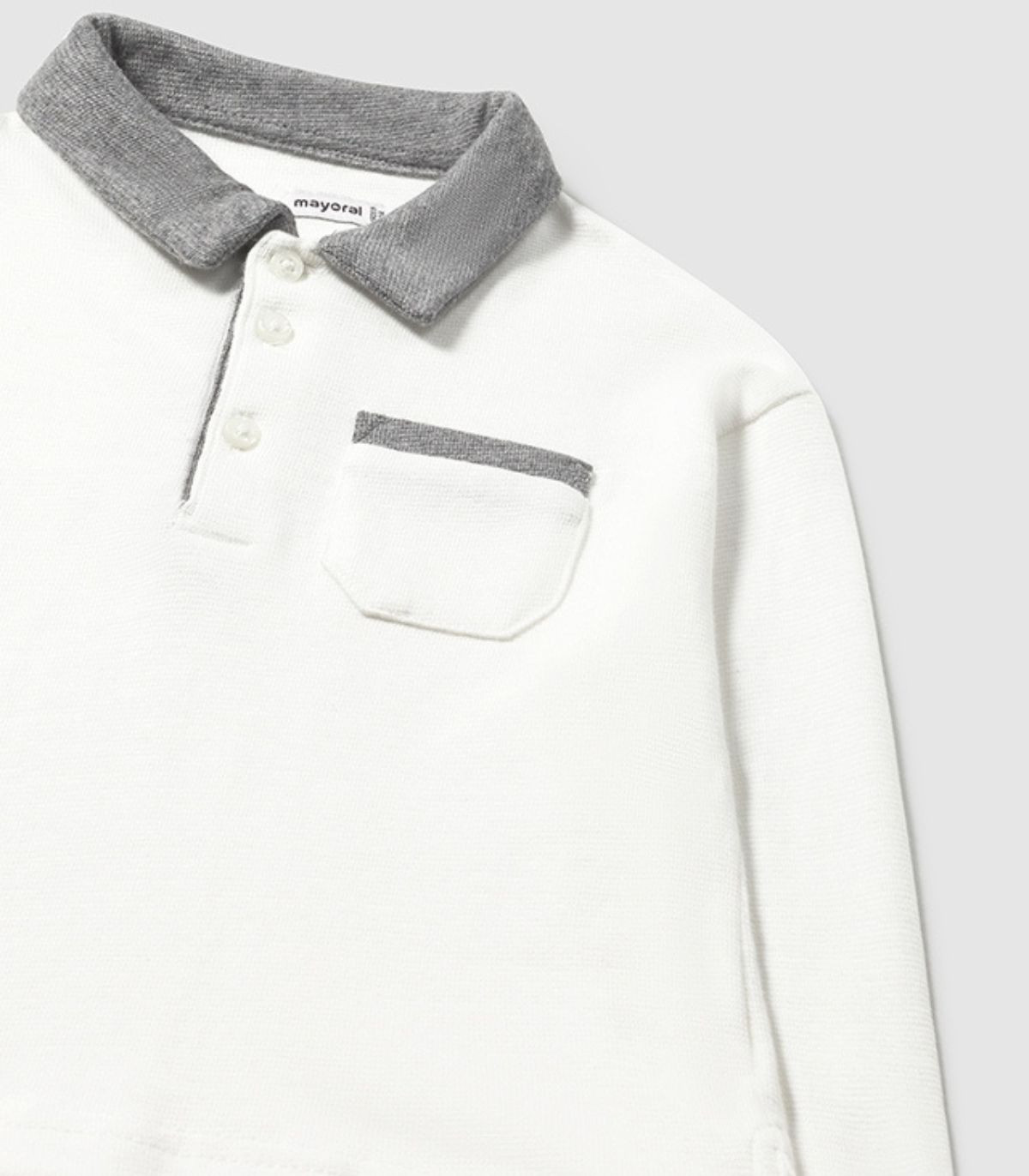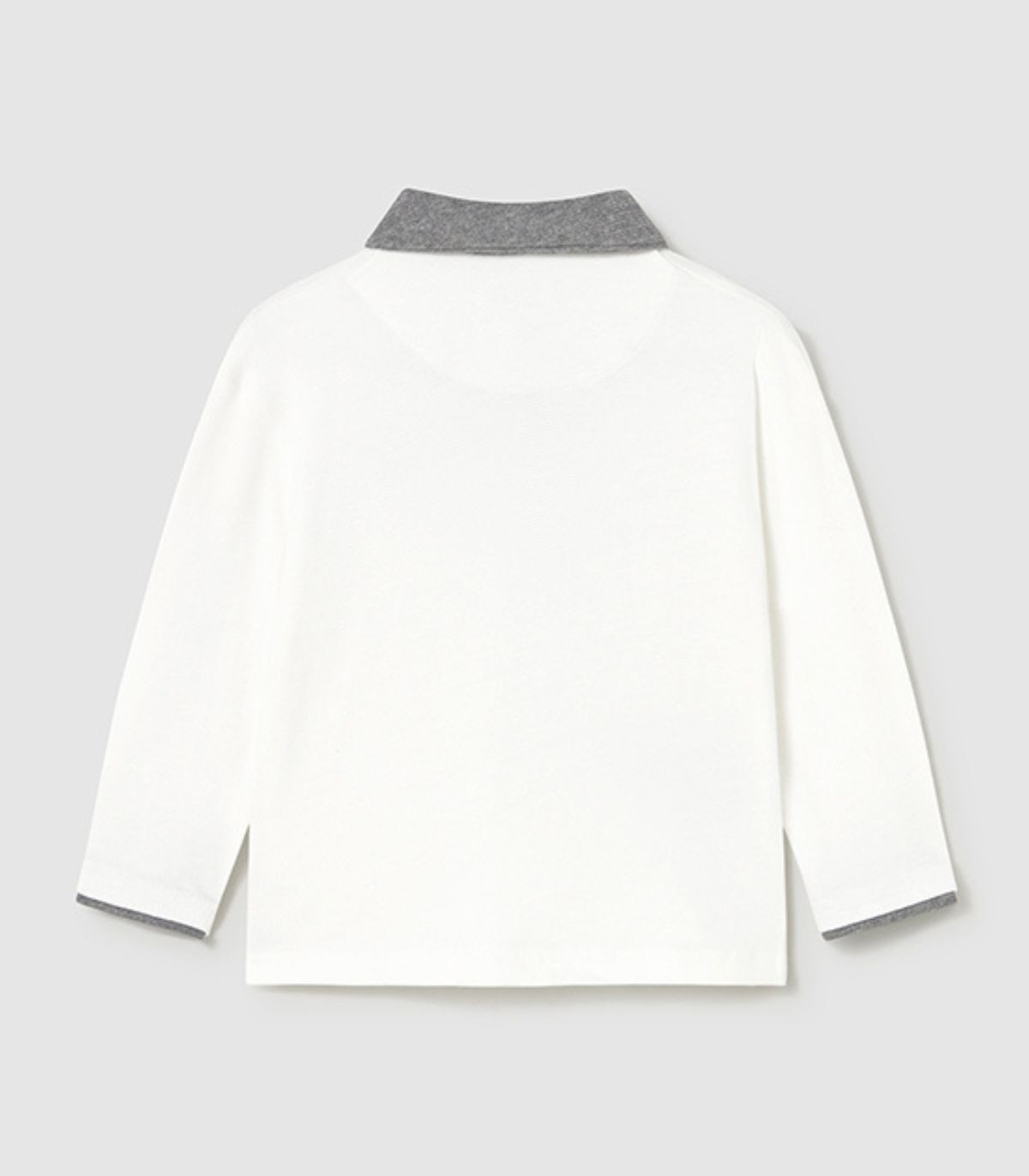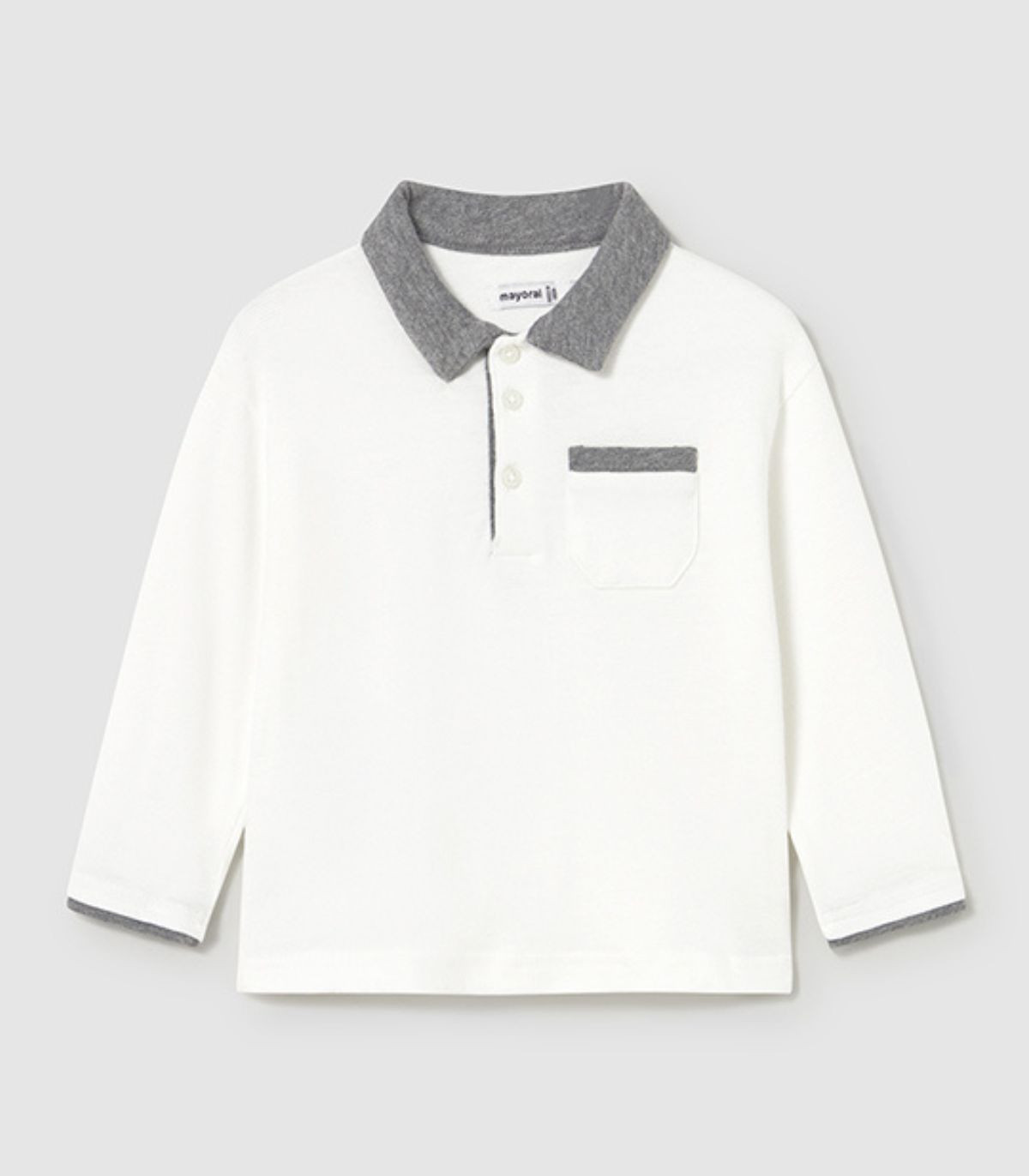 Polo de manga larga para niño de la colección otoño invierno de Mayoral, confeccionado en suave tejido de algodón ideal para el día a día. En tono blanco, presenta el clásico cuello de polo en contraste color gris y cierre con botones en la parte delantera. Como detalle, incluye un bolsillo funcional en el pecho que aporta un toque moderno y elegante al diseño.