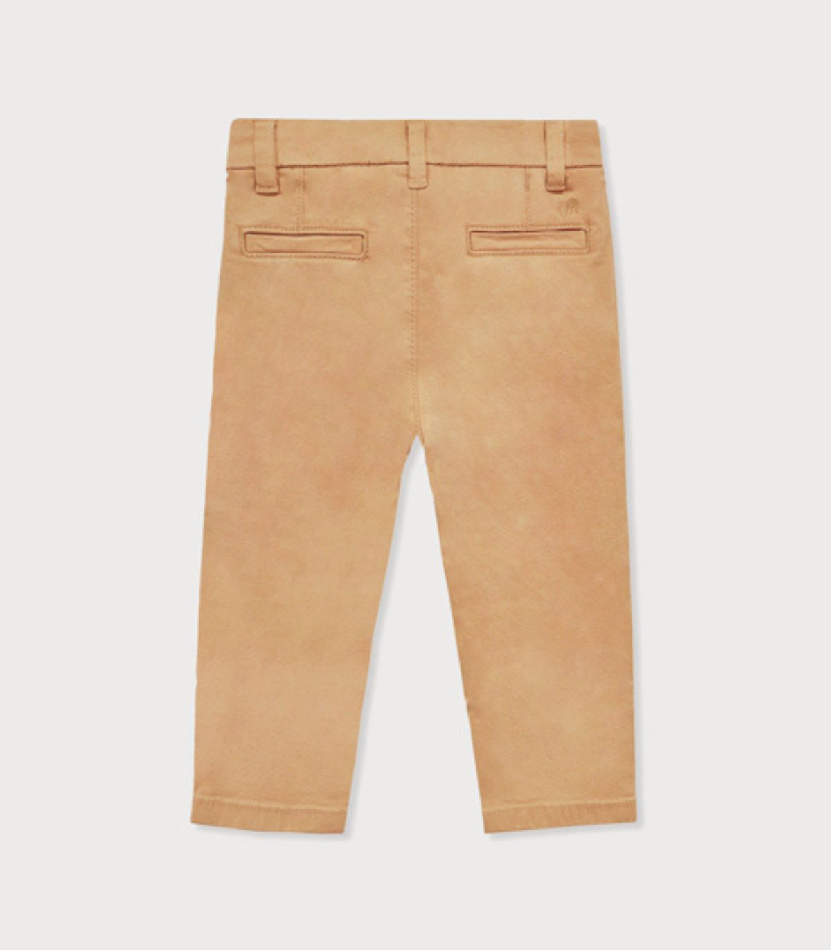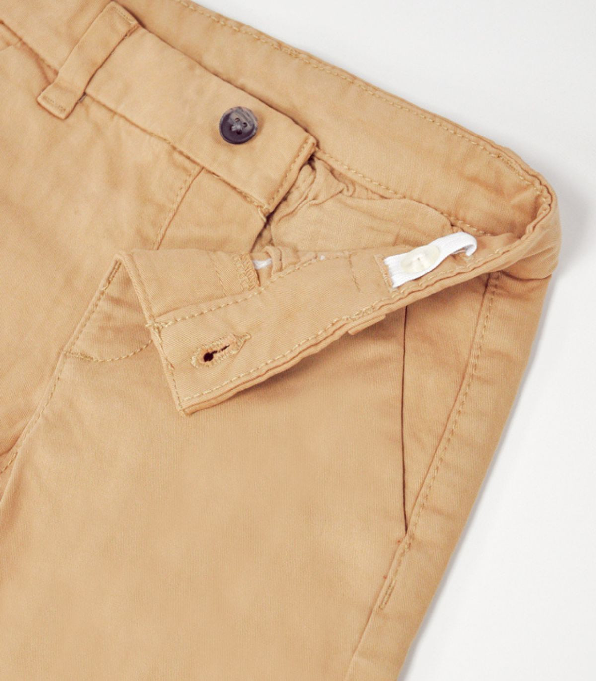 Pantalón largo para niño de la colección otoño invierno de Mayoral, de estilo chino y corte ajustado (slim fit), confeccionado en un cómodo tejido de sarga resistente y suave al tacto. Presenta cierre con un único botón y bragueta simulada. Incluye goma elástica regulable con botones en el interior de la cinturilla para un ajuste perfecto. Su diseño se completa con bolsillos funcionales en la parte delantera y bolsillos simulados en la parte trasera, ideal para un look elegante y confortable.