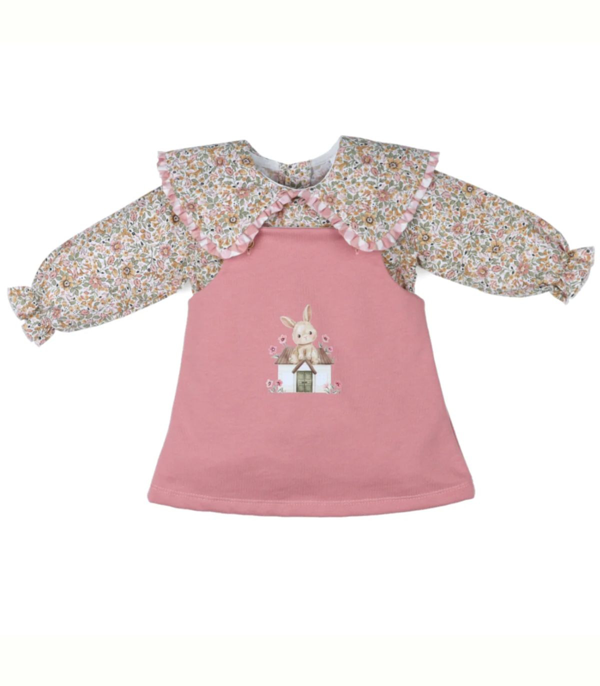 Conjunto de pichi y blusa para bebé niña de la colección otoño invierno, un conjunto dulce y confortable perfecto para los días más frescos. El pichi, confeccionado en suave tejido afelpado en tono rosa empolvado, se abrocha en el delantero y lleva como detalle un bonito dibujo en el centro. La blusa, de manga larga y cuello bebé, está confeccionada en tejido con delicado estampado liberty que aporta un toque encantador y femenino al conjunto.