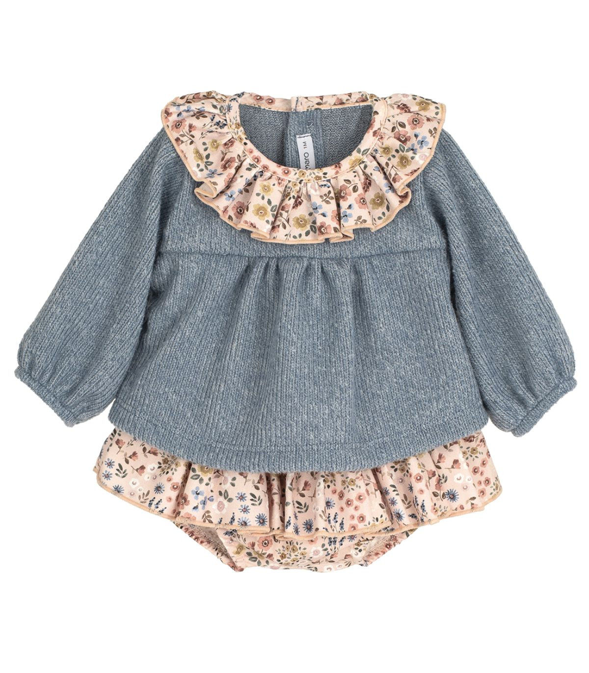 Conjunto de dos piezas para bebé niña de la colección otoño invierno. El conjunto incluye una camiseta de manga larga con volante en el cuello y una ranita con volante a juego confeccionada en tejido tono rosa con estampado liberty. La ranita lleva elásticos para un ajuste perfecto, creando un conjunto dulce, cómodo y con mucho encanto.