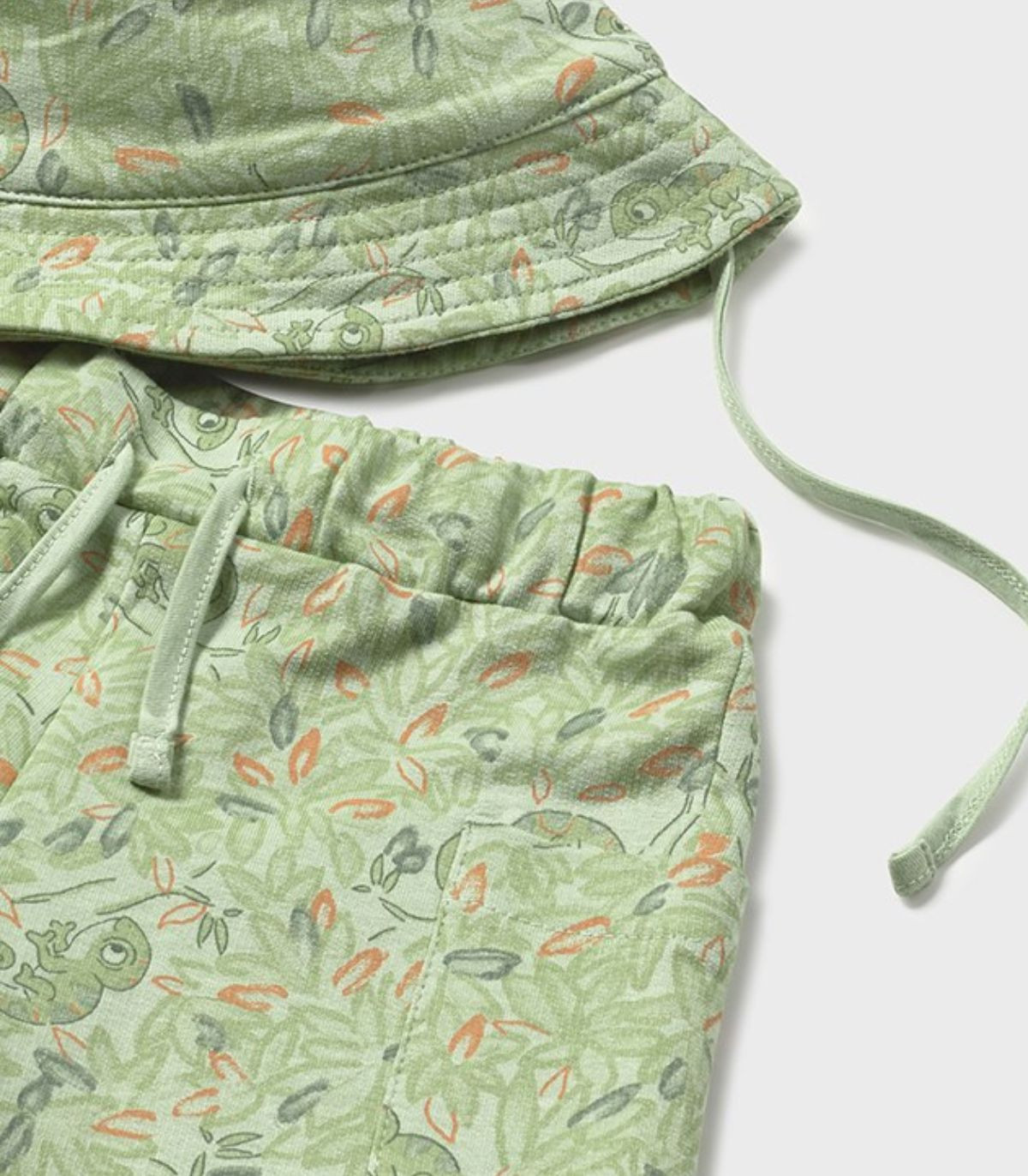 Conjunto de punto de 3 piezas para niño de Mayoral, compuesto por pantalón corto, camiseta y gorro, confeccionado en algodón suave y cómodo. El pantalón corto en tono verde con estampado infantil incorpora cintura elástica y dos bolsillos laterales. La camiseta en tono natural, de manga corta y cuello redondo, se abrocha con botón en el hombro para facilitar la puesta y luce un dibujo central a juego con el pantalón. Completa el conjunto un gorro en el mismo tejido y estampado, ideal para los días de sol. En Confetti Bebé seleccionamos cada prenda con cuidado y la preparamos con mimo para que la recibas como se merece.