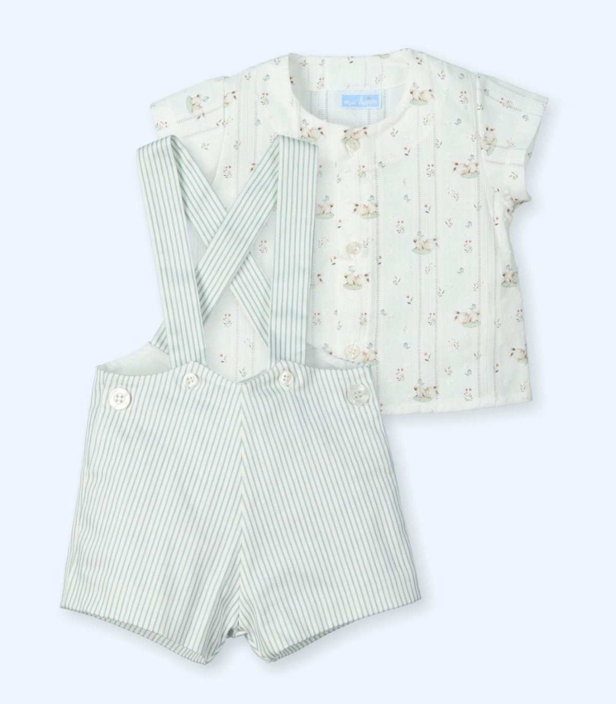 Conjunto para bebé niño de Mac Ilusión, perteneciente a la colección Conejitos, diseñado con un estilo dulce y cuidado. El pantalón corto con tirantes, en tono blanco con finas rayas en verde, se abrocha en la cintura, aportando un aire clásico y cómodo. La camisa, de manga corta y cuello mao, presenta un delicado estampado de conejitos sobre fondo blanco que aporta un toque encantador. Se abrocha en la parte delantera con botones, facilitando su puesta. Un conjunto fresco y especial, ideal para el día a día o momentos señalados. En Confetti Bebé preparamos cada prenda con mimo para que la recibas como se merece.