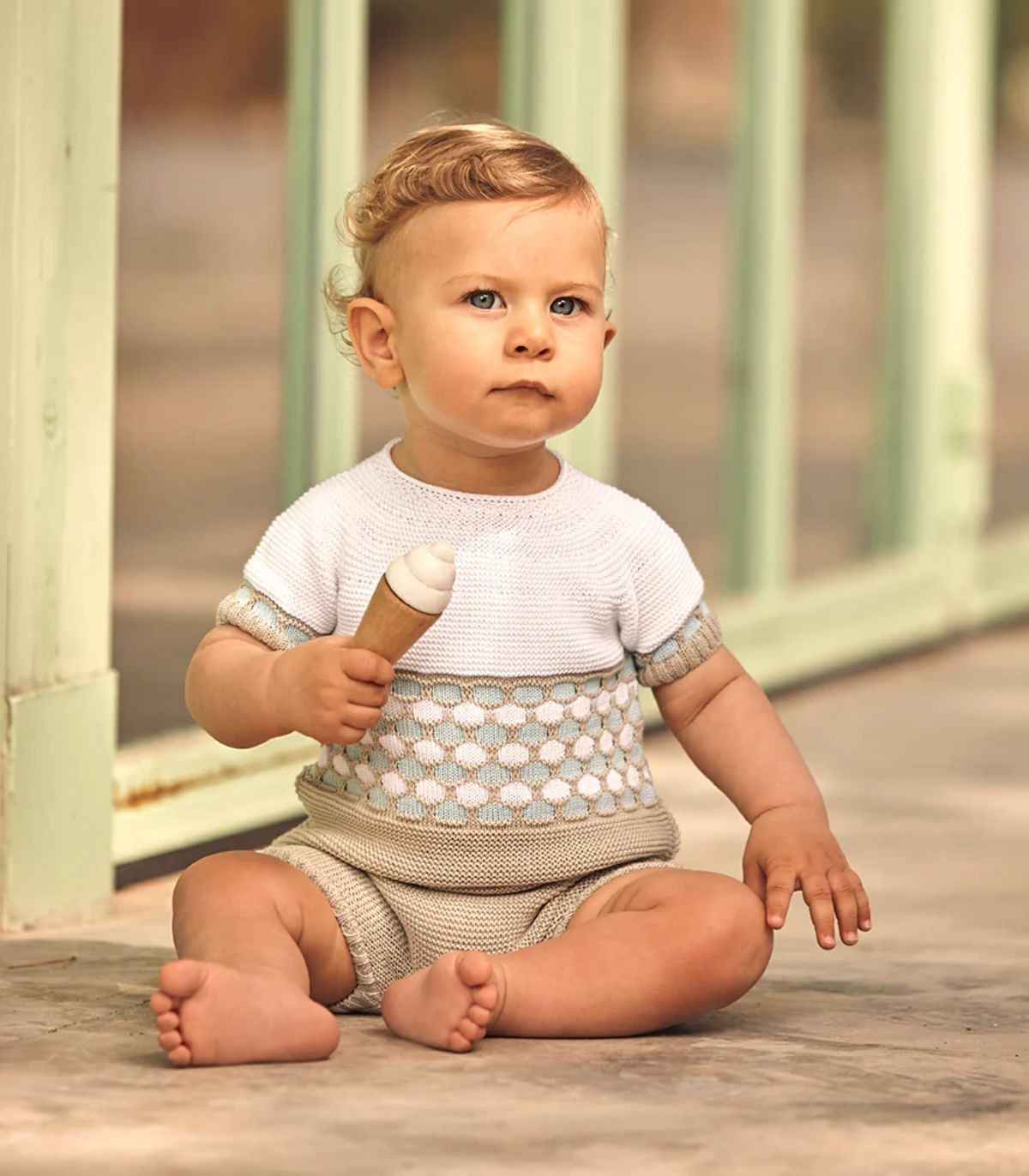 Conjunto para bebé niño de Mac Ilusión, perteneciente a la colección Conejitos, diseñado con un estilo dulce y cuidado. El pantalón corto con tirantes, en tono blanco con finas rayas en verde, se abrocha en la...