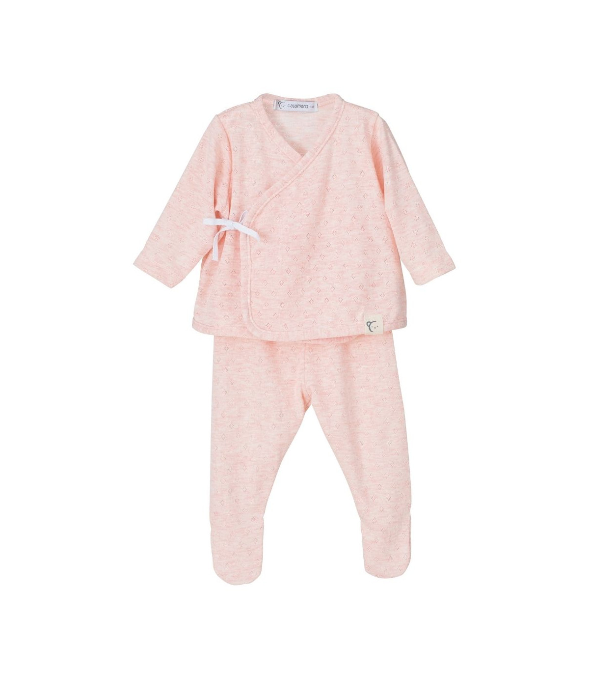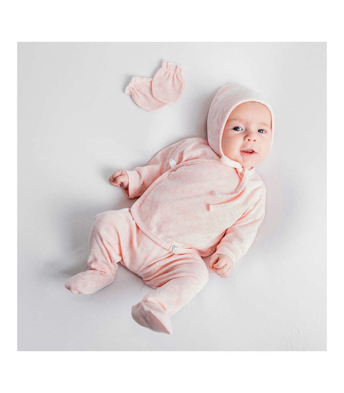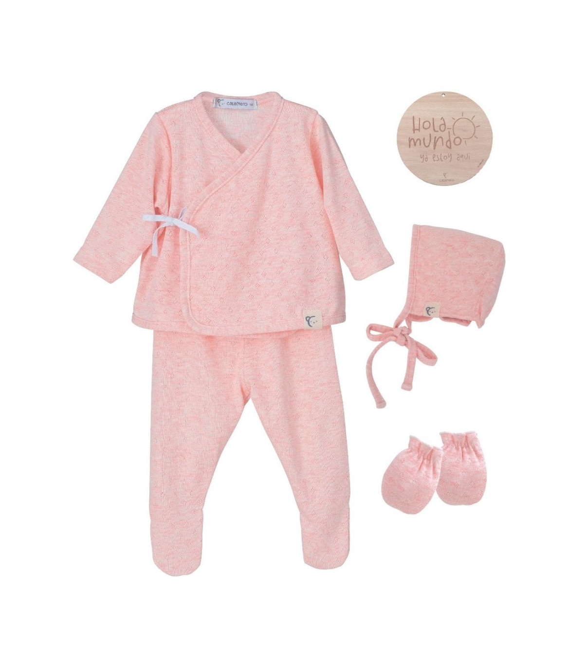 Pack primera puesta atemporal para recién nacido que incluye el jubón cruzado y anudado en la parte delantera, la polaina, las manoplas y la capotita todo a juego en tono rosa. Confeccionado en tejido caladito de alta calidad, 100% algodón. Tejido suave y delicado que resulta perfecto para la piel sensible del recién nacido. Talla única