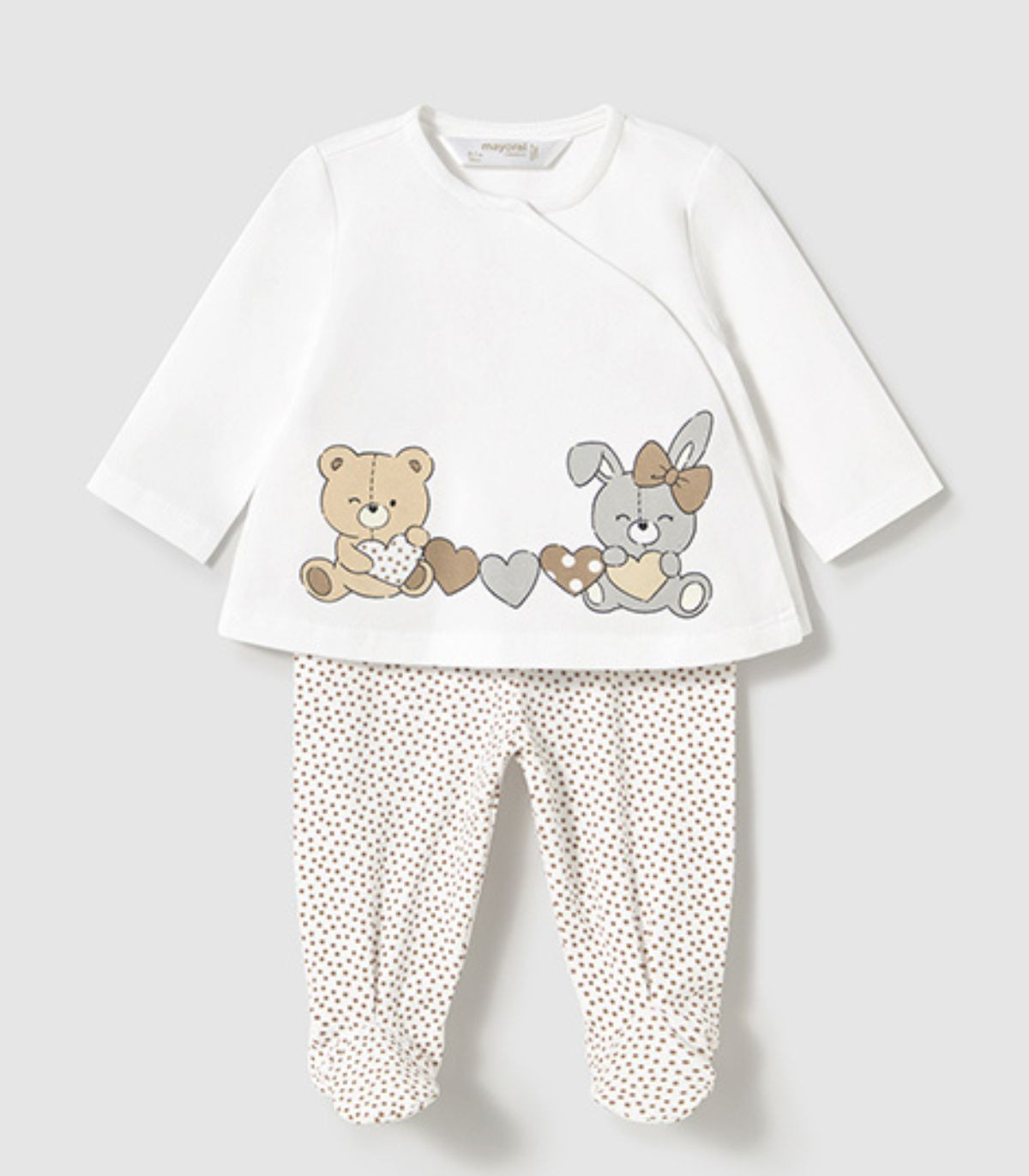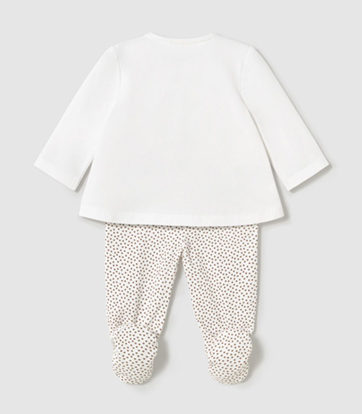 Encantador conjunto para bebé niña de Mayoral, ideal para la temporada primavera-verano y perfecto para los primeros meses del bebé. La camiseta de manga larga con cuello redondo y con un divertido e infantil diseño estampado en el delantero, viene con cierres a presión en el lateral de la parte delantera para facilitar su puesta. La polaina a juego, con cintura elástica, garantiza un ajuste perfecto y máxima comodidad para el bebé. Un conjunto suave, fresco y funcional, ideal para cualquier ocasión.