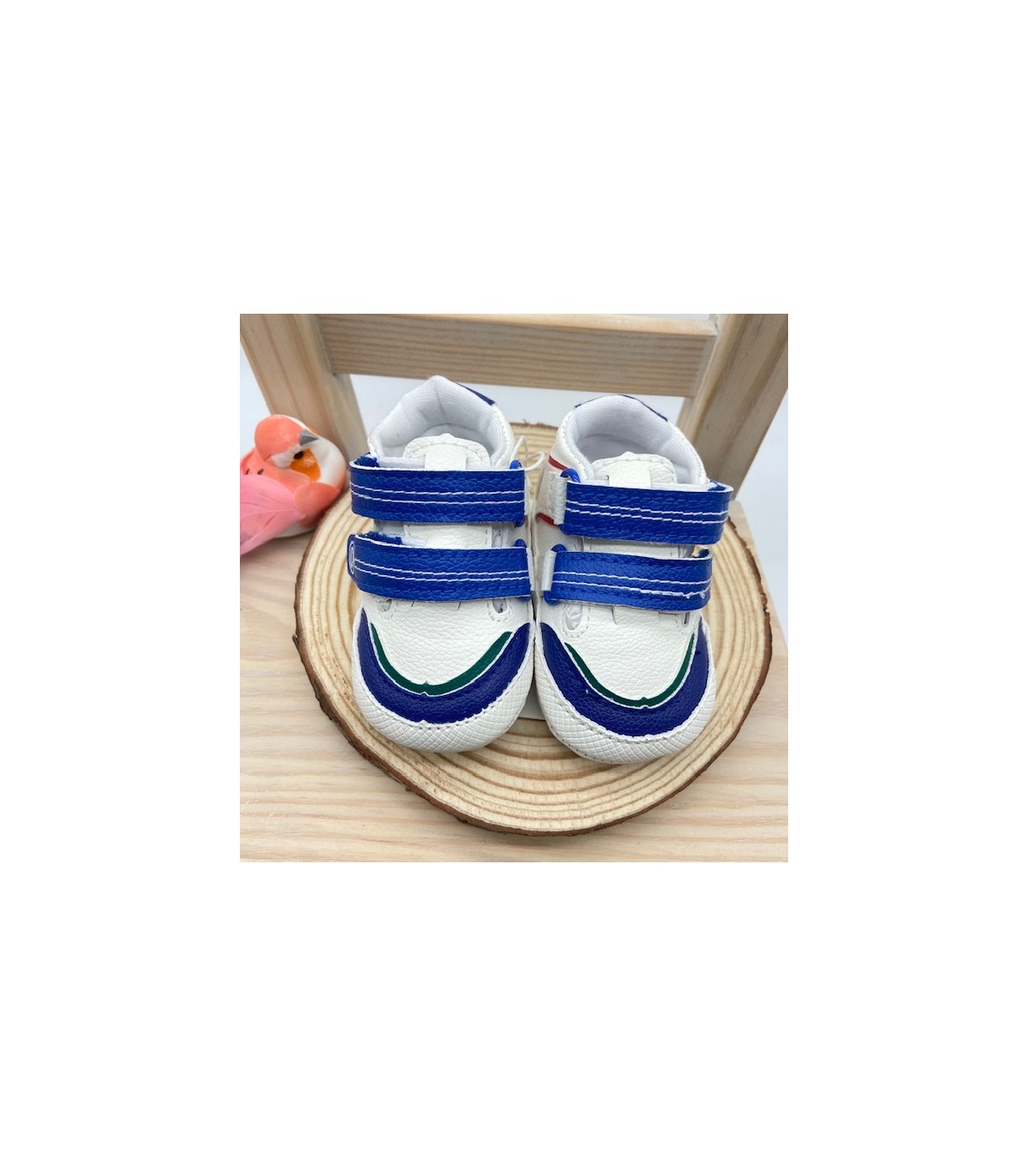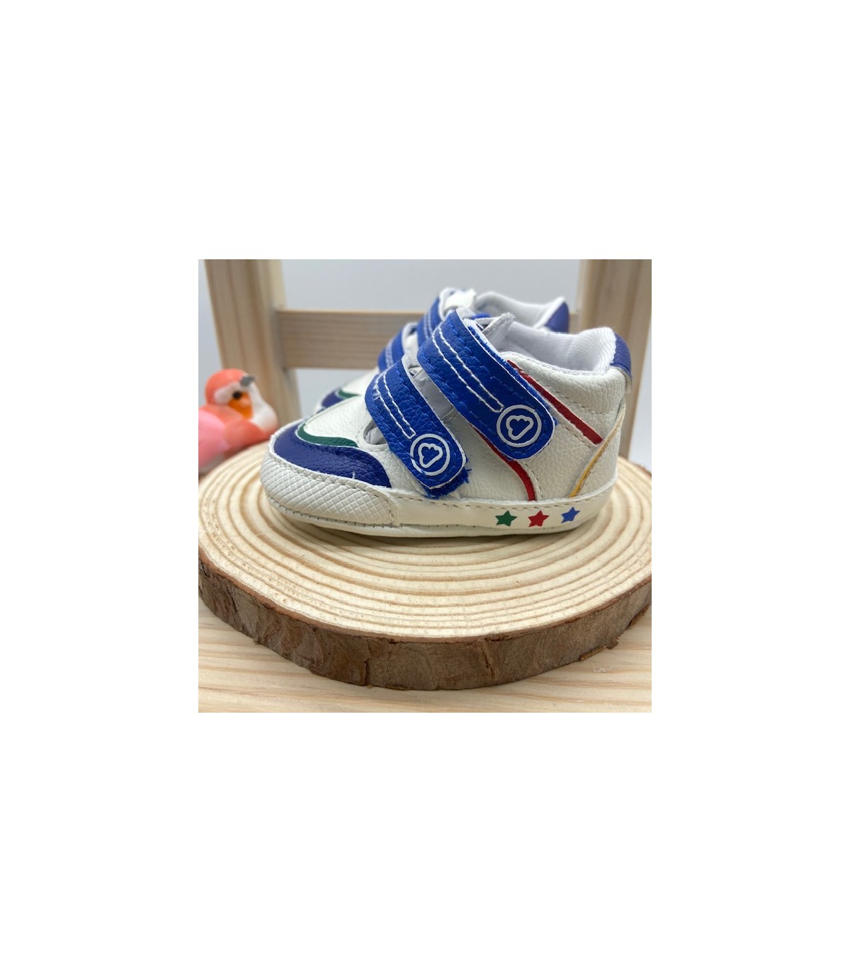 Deportiva en tono blanco combinado en azul, rojo, amarillo y verde. Cierre en velcro y suela blanda