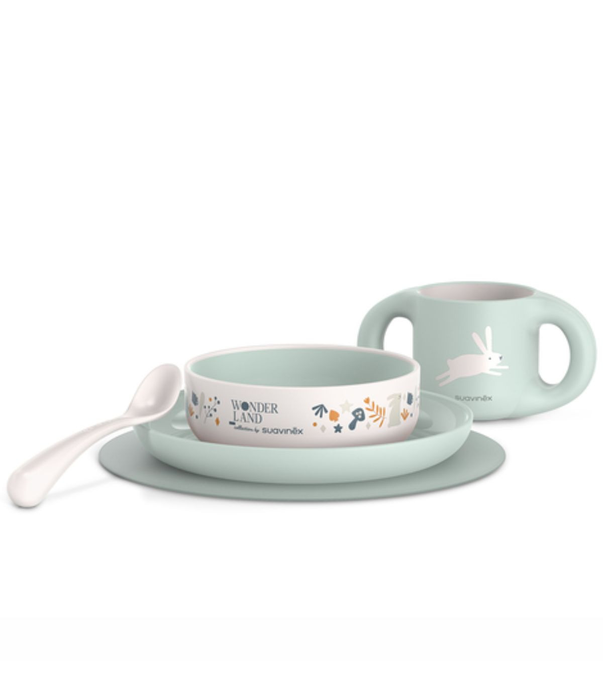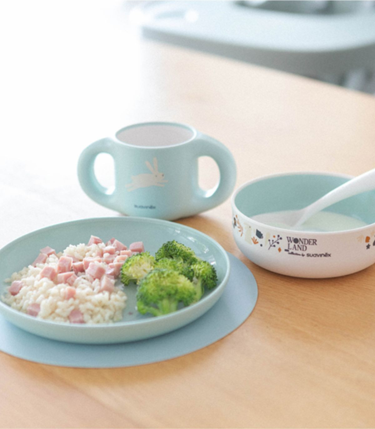 Vajilla compuesta por plato llano y bol de gran capacidad, taza con grandes asitas que facilitan su agarre, cuchara ergonómica ideal para papillas y potitos, y mantel antideslizante que evita que el plato se mueva.