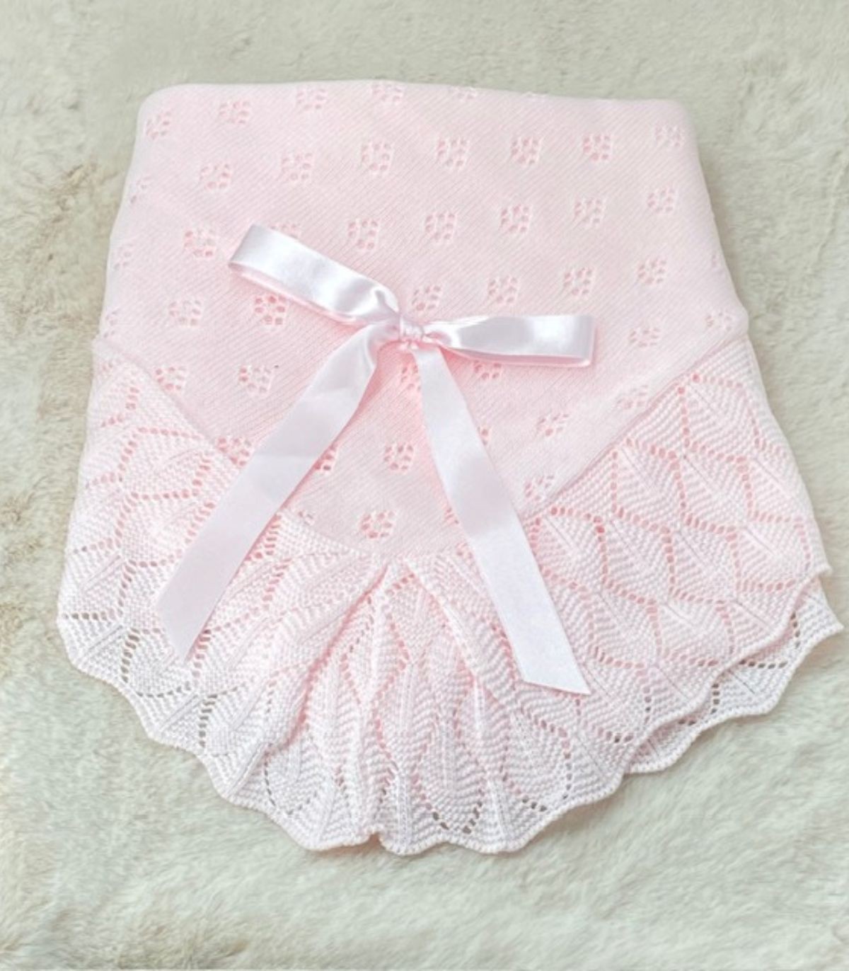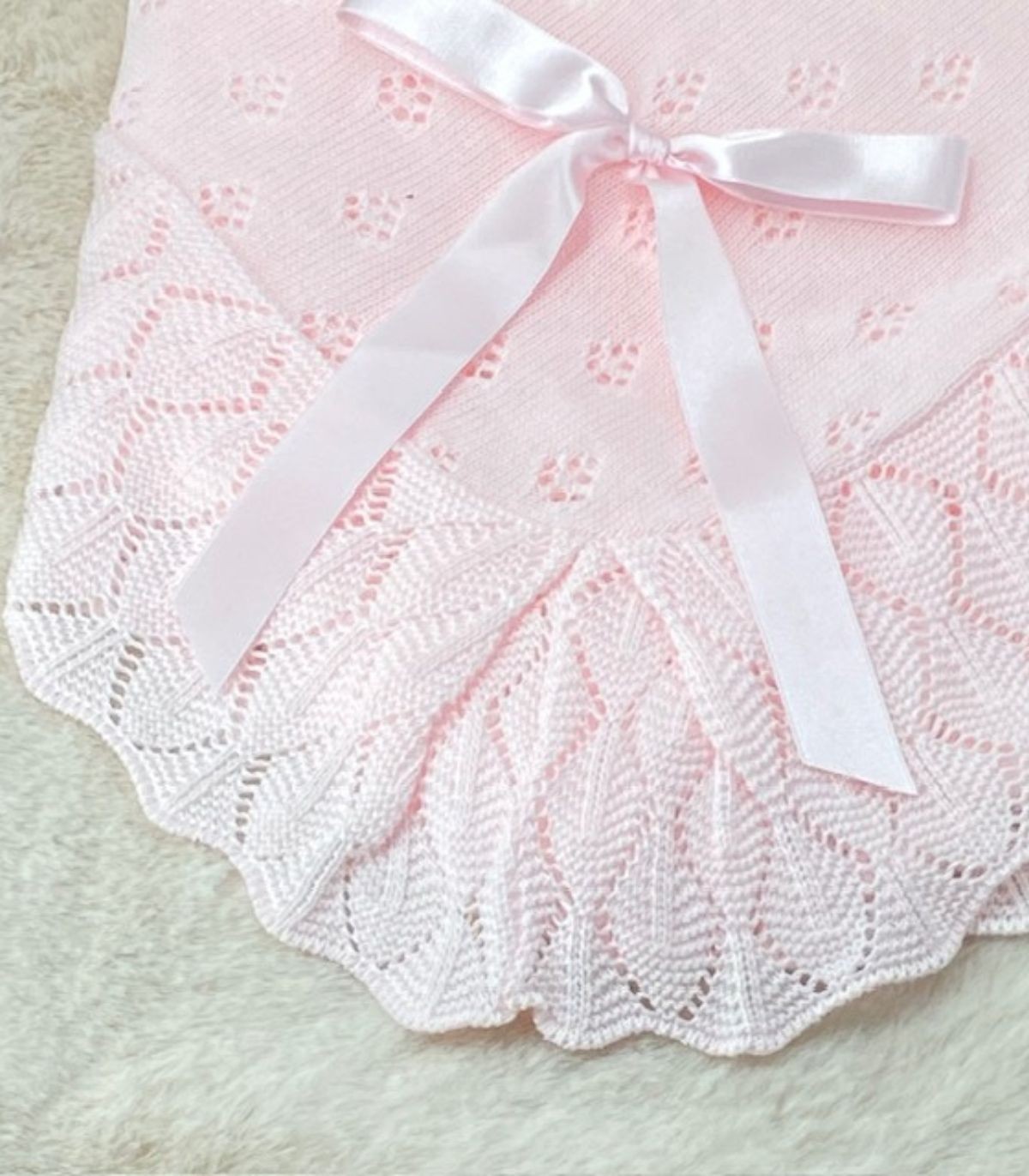 Toquilla para bebé confeccionada en suave hilo de color rosa. Su diseño presenta un bonito volante calado y un lazo al tono que añade un toque de dulzura y encanto. Esta toquilla es perfecta para mantener abrigadito a tu bebé durante las estaciones de primavera y verano.
